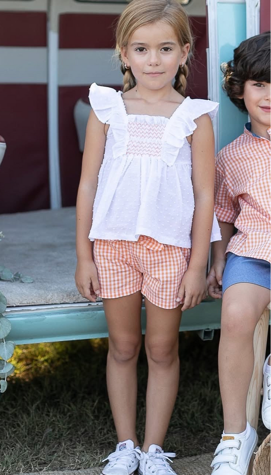 Conjunto niña blusón plumeti blanco y short vichy naranja - Coco Acqua