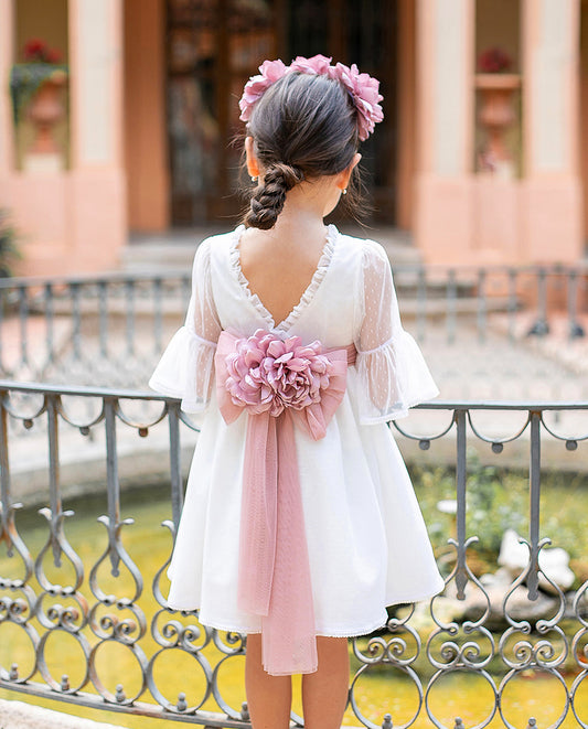 Vestido niña blanco y fajín rosa empolvado - de Coco Acqua Colección 2025 Ceremonia
