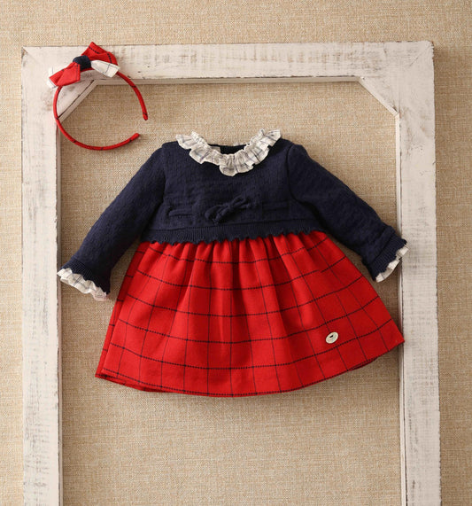 Vestido bebé, cuerpo en punto azul marino y falda cuadros- Basmarti invierno 2022