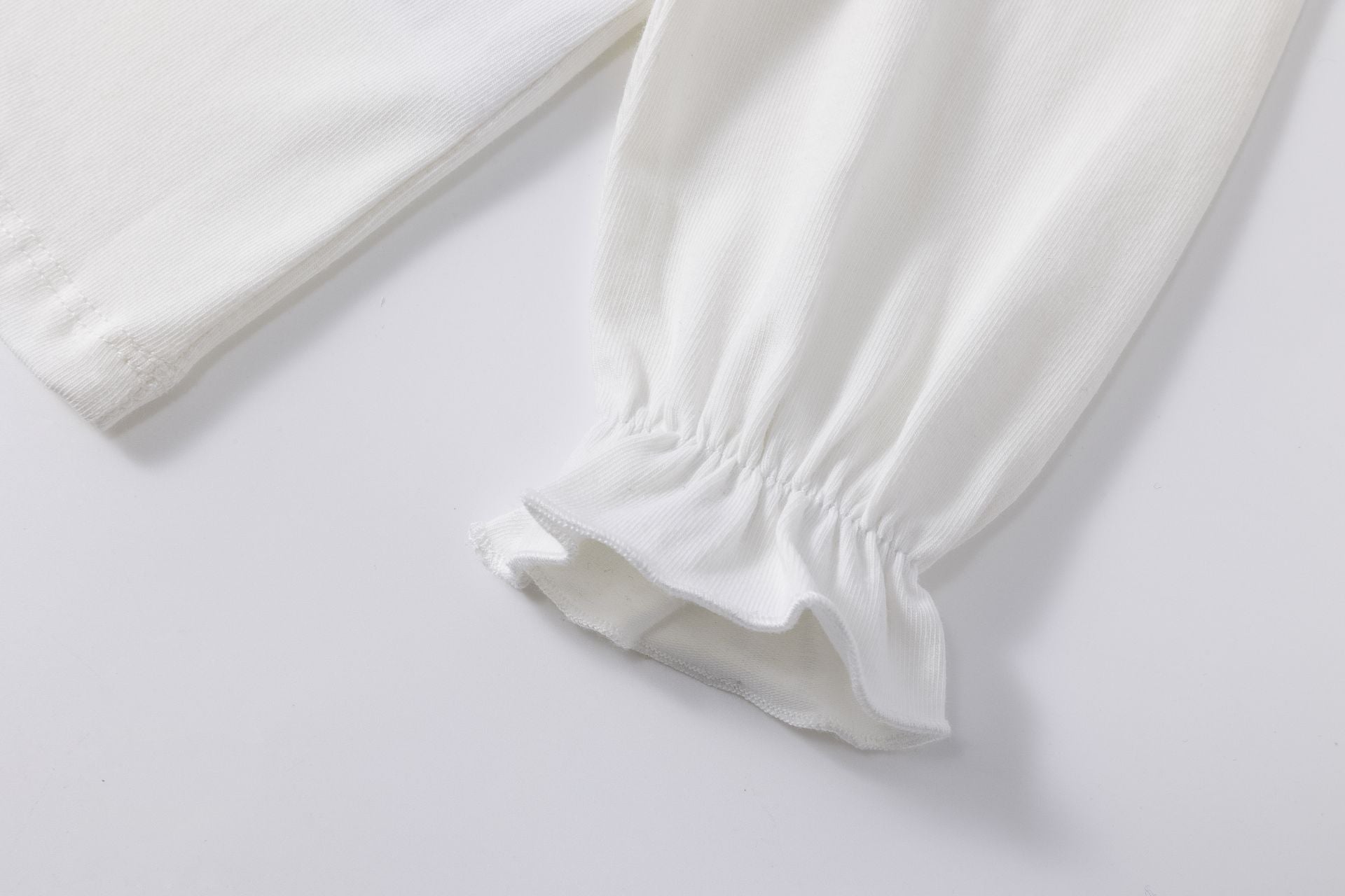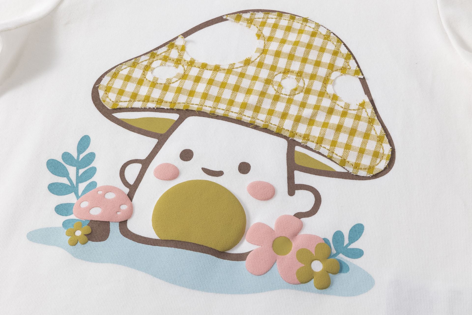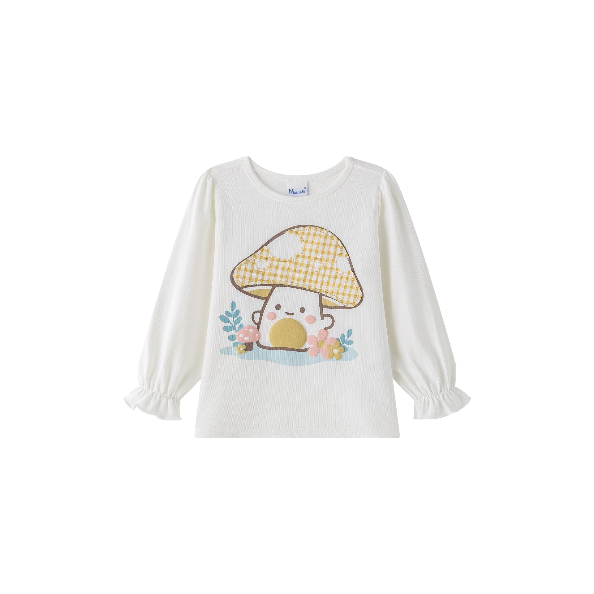 Camiseta de niña, es de manga larga con puños con elástico, cuello redondo y con parche de tejidos de cuadros de grafico seta 🍄