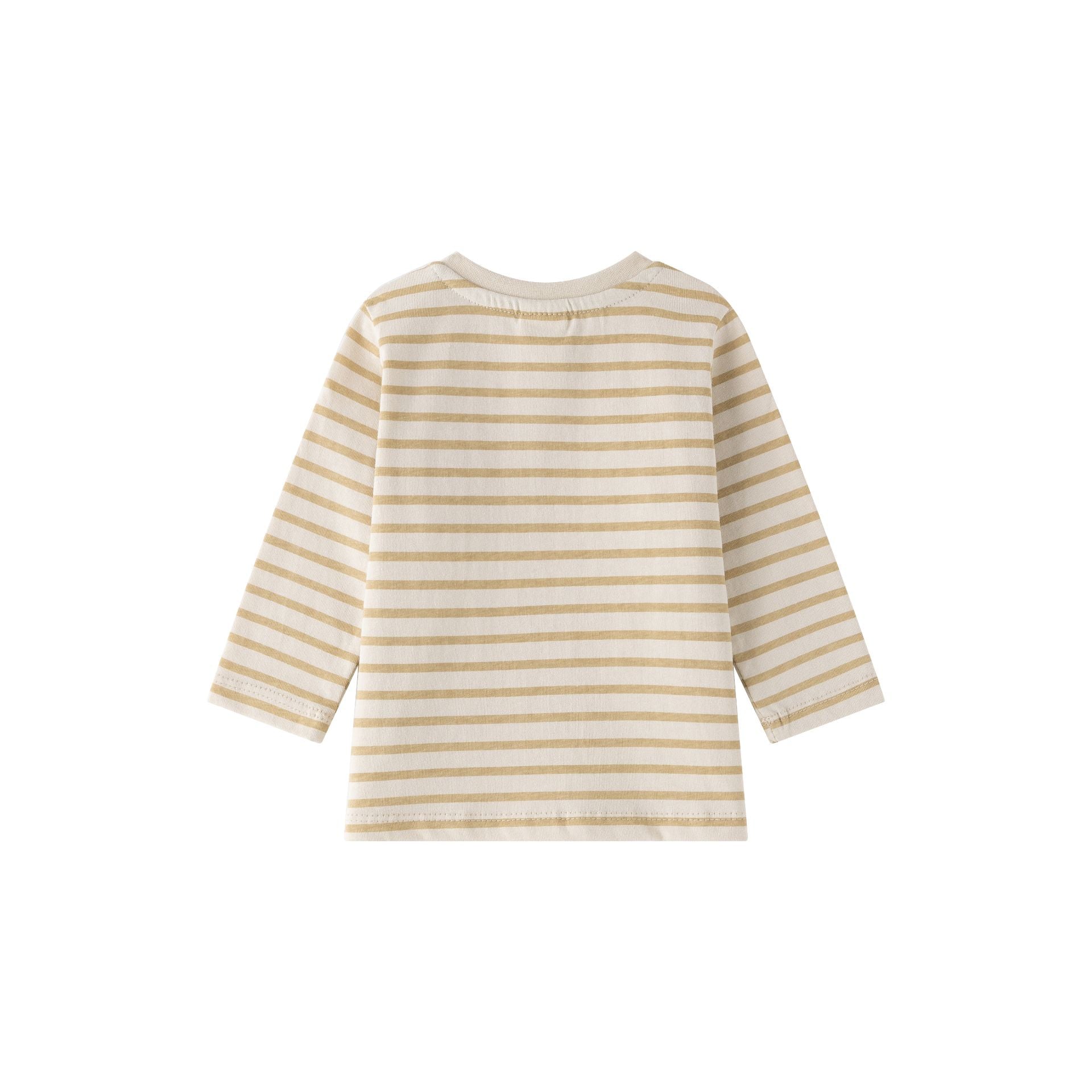 Camiseta manga larga en beige en rayas de bebe niño. Con gráfico en el bolsillo de Dino, cuello caja, abertura de corchetes en hombro.