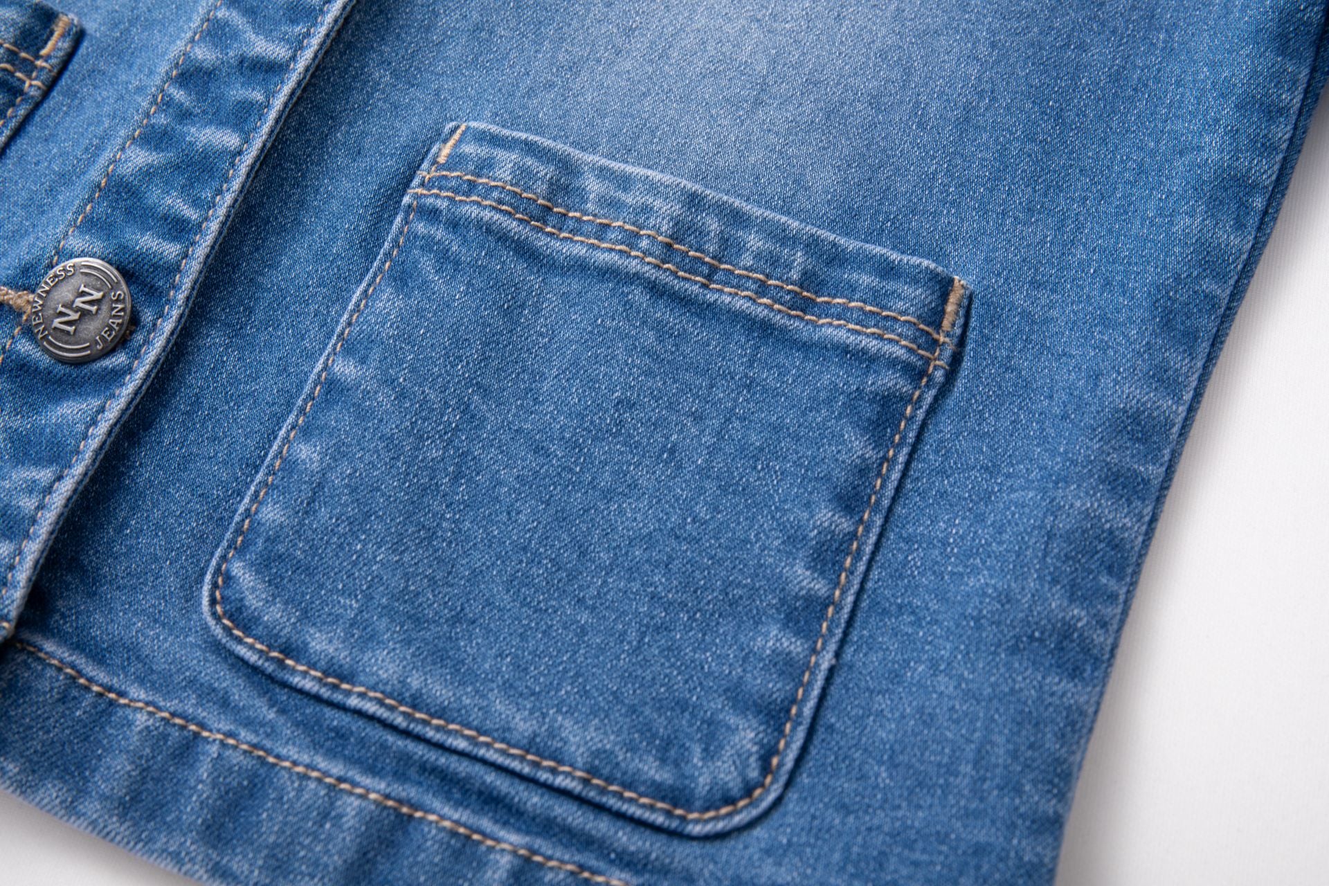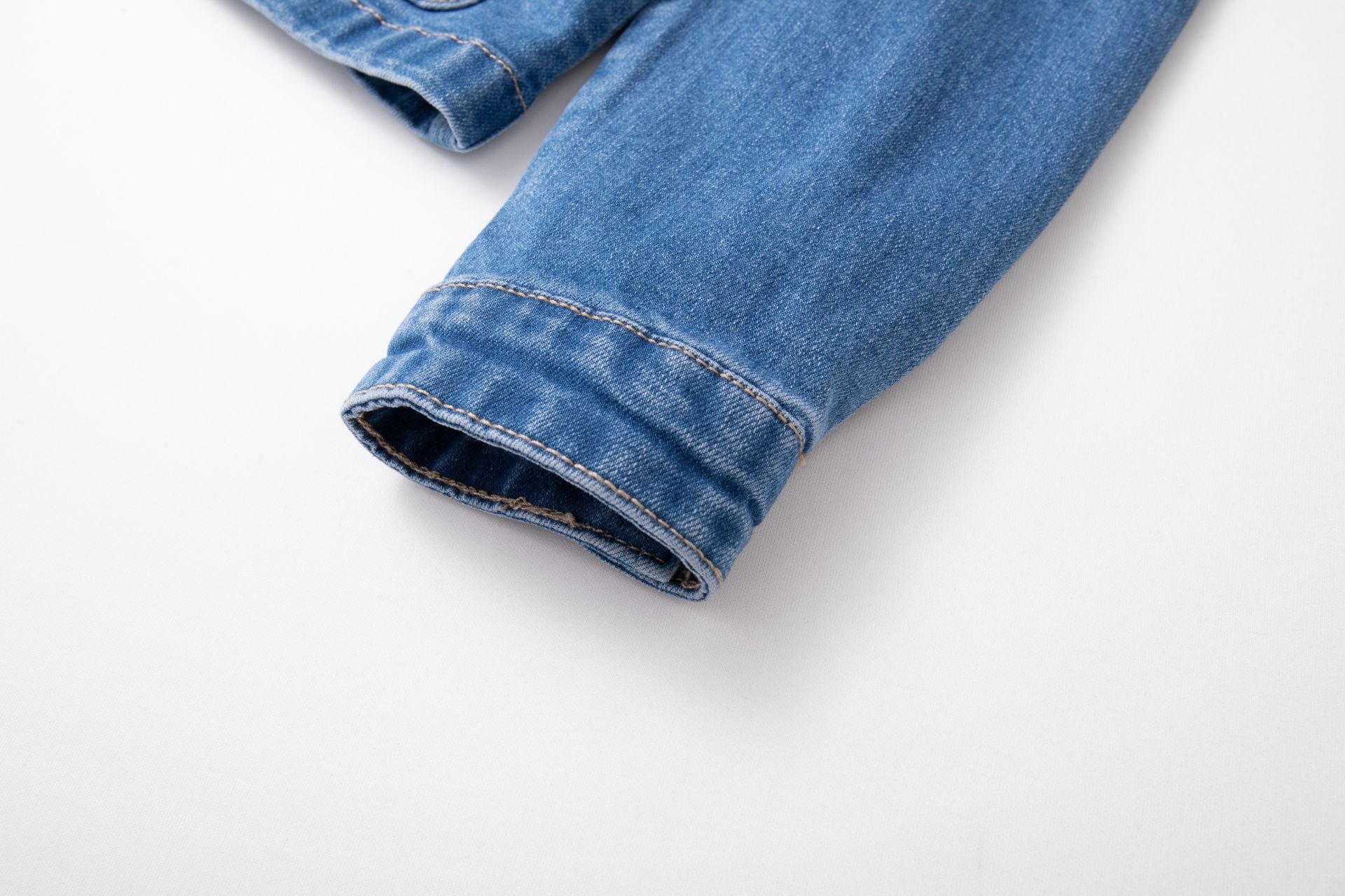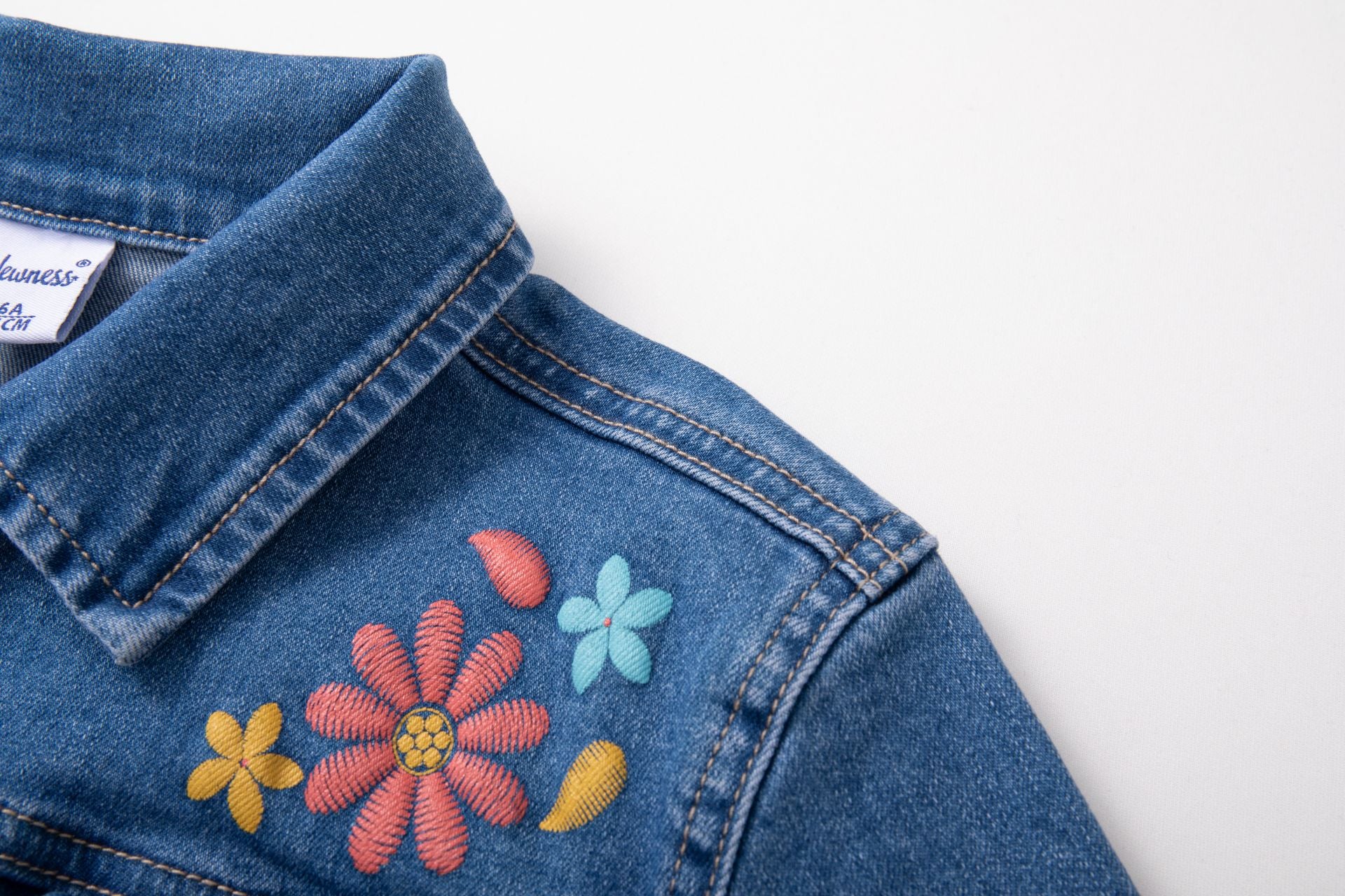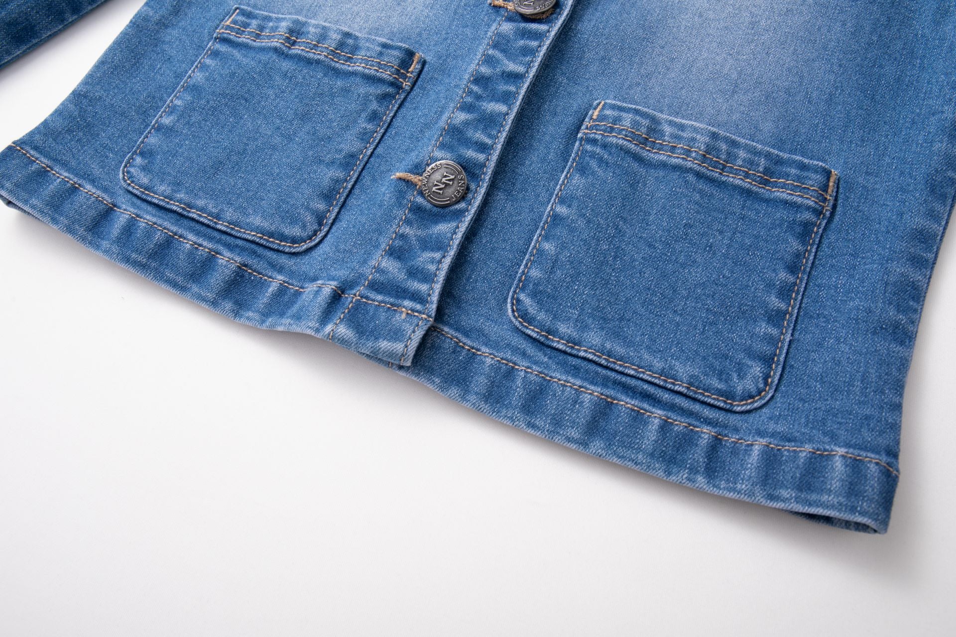 Chaqueta en tejido vaquero, con cierre delantero de botones metálicos. Bolsillos de parche, volante, estampados en delantero y cuello camisero.