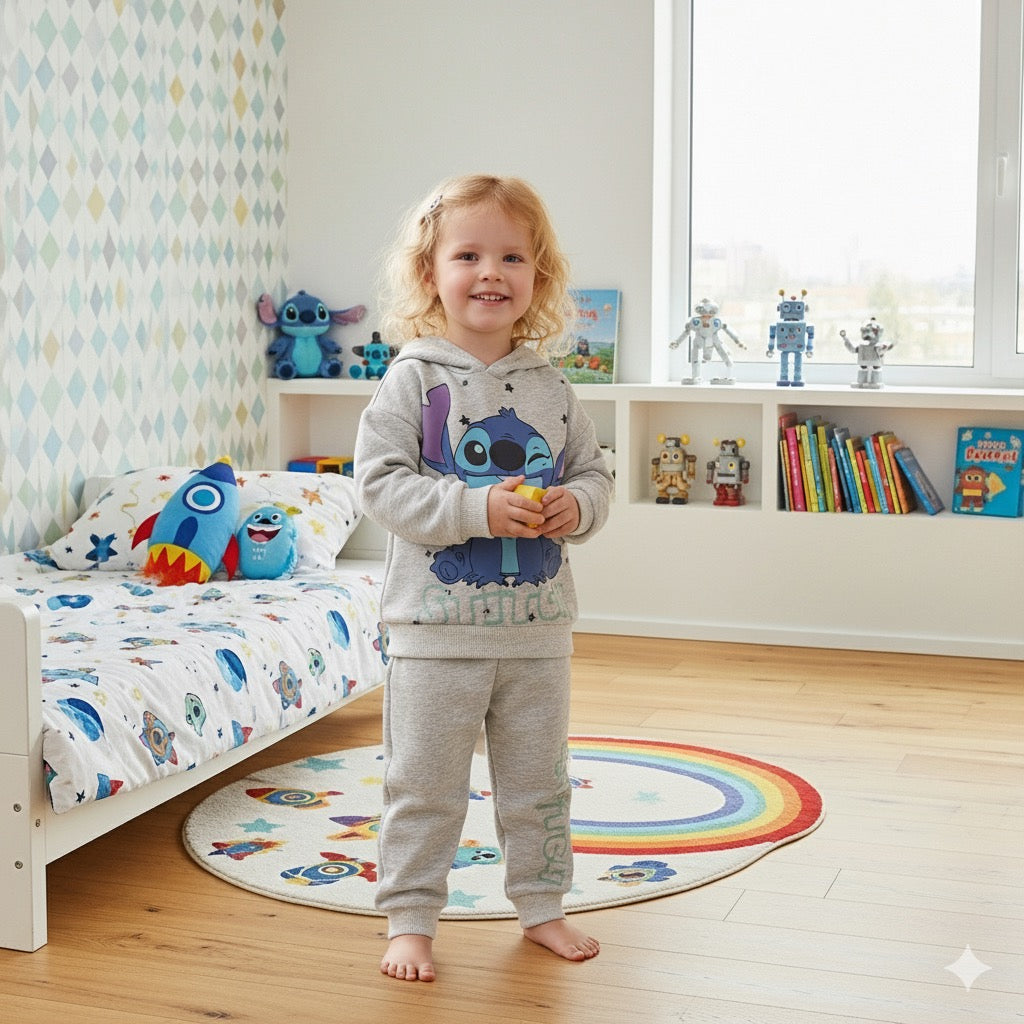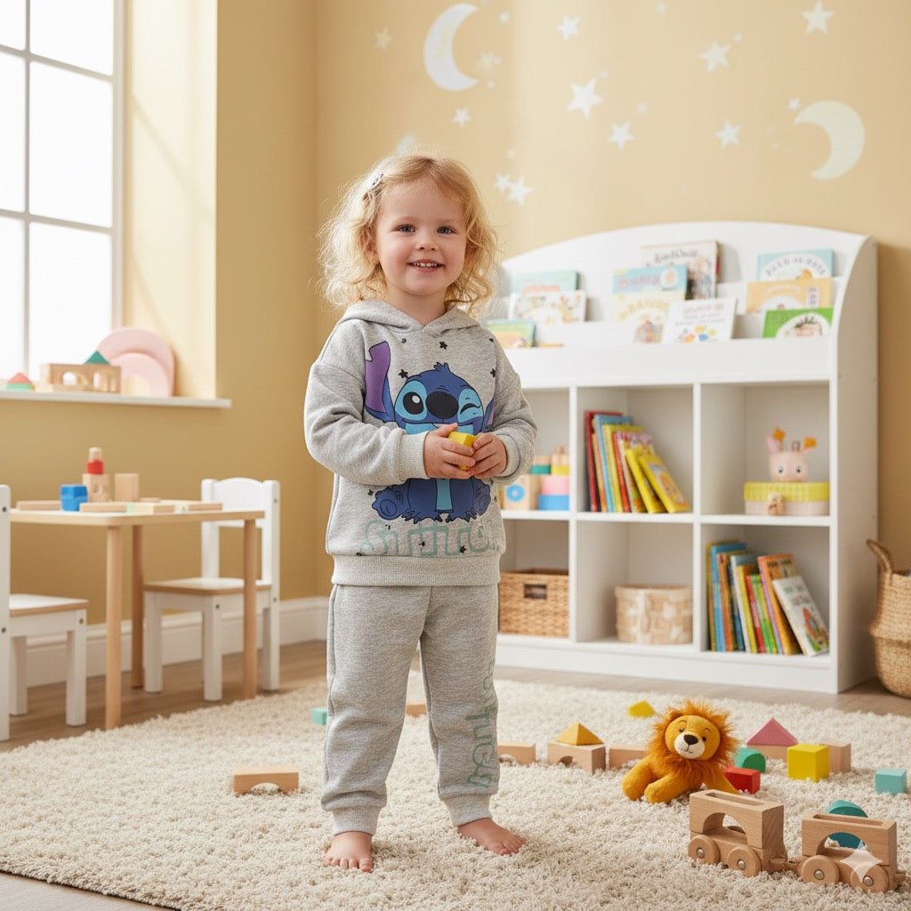 Chandal de bebé en color gris, con los dibujos de Stitch con capucha y orejitas