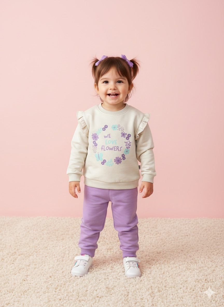 🎀 Conjunto jogging y sudadera con volantes a tono en hombros, estampado flores en relieve en la parte delantera, botón el la parte trasera, con pantalón del color morado. Cintura con goma