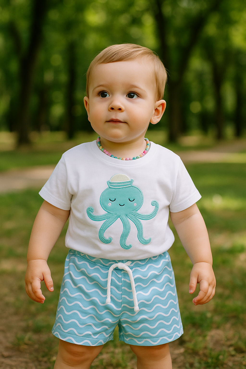 Precioso conjunto de baño para niño, camiseta de manga corta en blanca, cuello redondo y un precioso pulpo en color azul turquesa, en el centro de la camiseta.