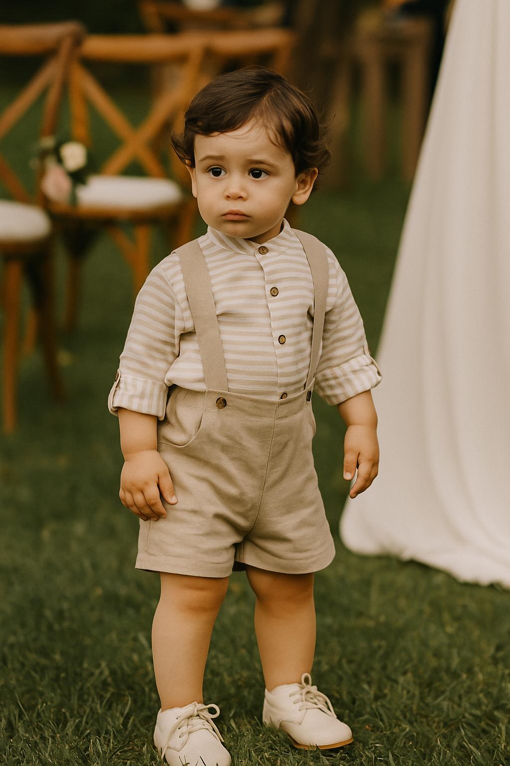 Conjunto de bebé niño, compuesto por camisa de manga larga sin puños, con rayas en tostado atravesadas, cuello Mao y abotonado en la parte delantera.