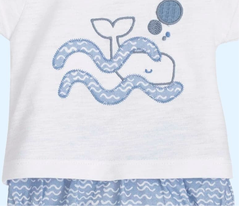 Presenta un bordado de gran tamaño que muestra una ballena y burbujas en color azul. El diseño utiliza diferentes texturas de puntada para representar las olas y el cuerpo del animal. Dispone de botones de presión en la parte posterior del cuello para facilitar el cambio de ropa.
