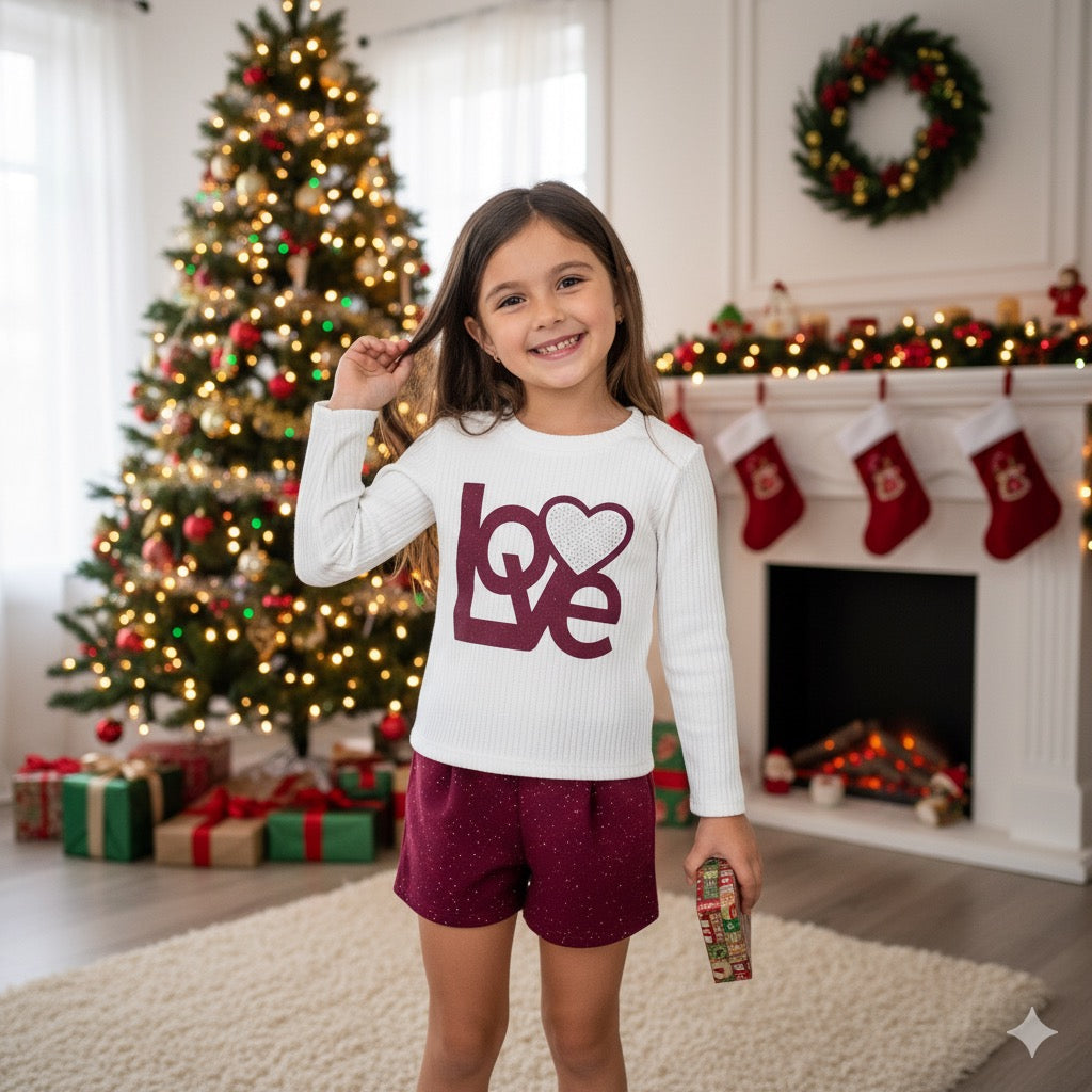 Este adorable conjunto es perfecto para las pequeñas de la casa. Incluye un suave suéter de manga larga en blanco con un encantador diseño de corazones, y una elegante falda pantalón plisada en color vino con detalles de botones dorados. Ideal para ocasiones especiales o para el día a día, combinando comodidad y estilo.