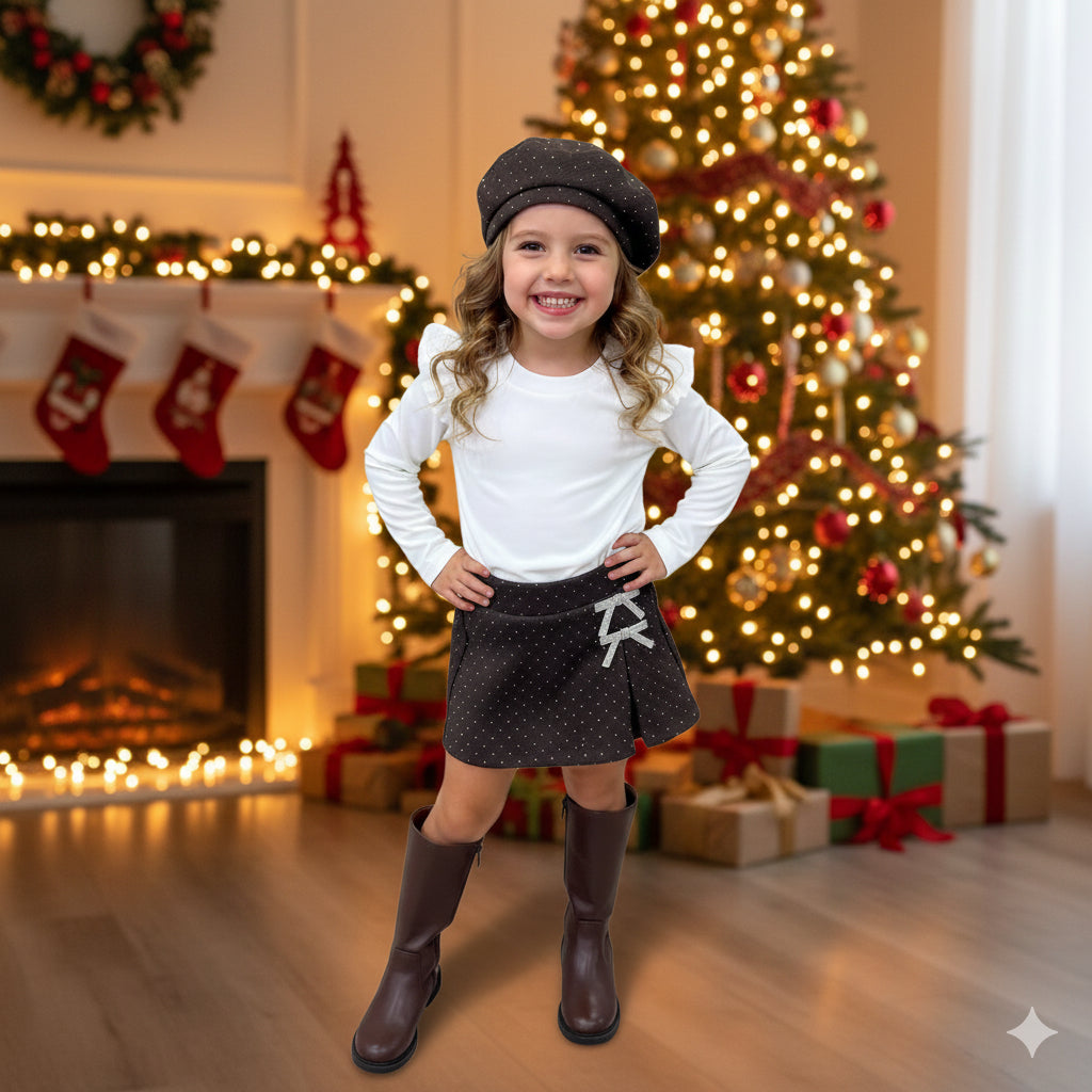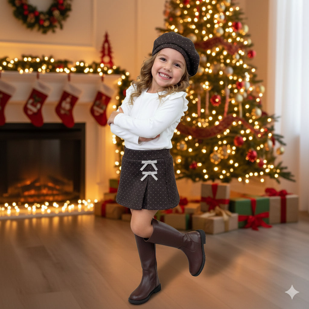 Falda pantalón en tono marrón oscuro, con un delicado destellos de brillos y dos lazos decorativo, va con boina coordinada en marrón con lazo.