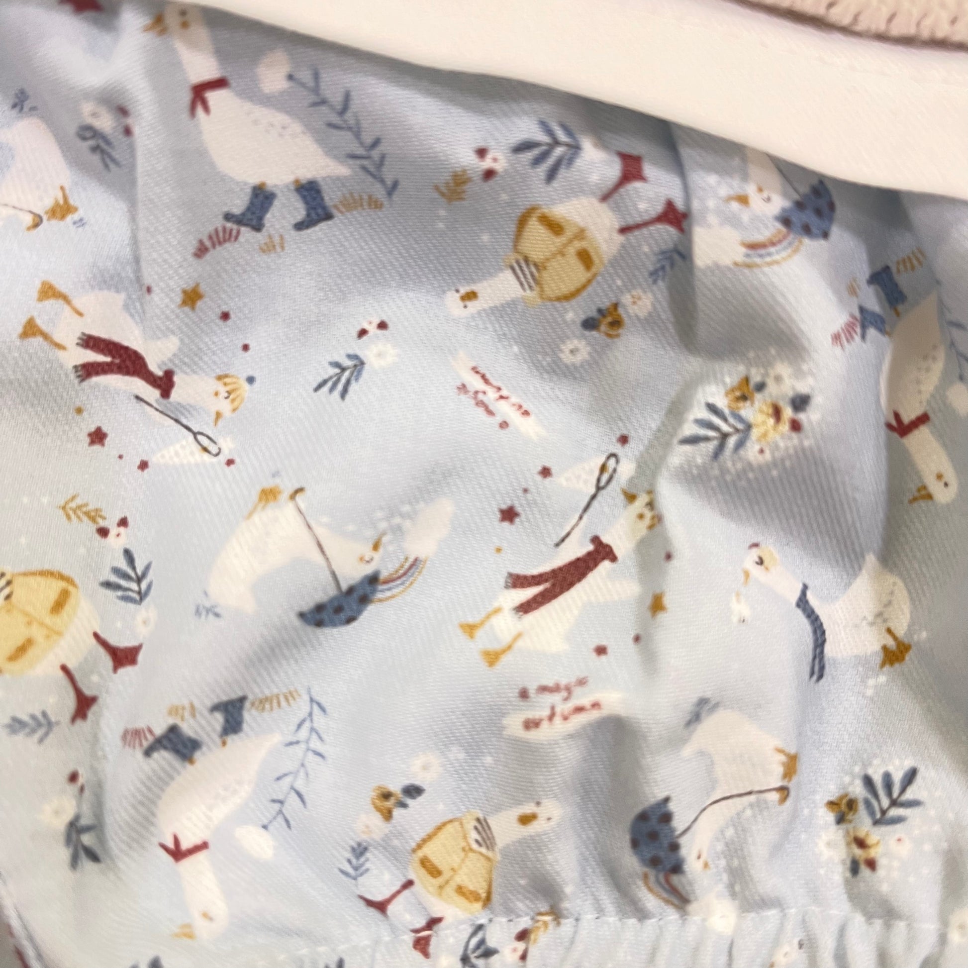 Conjunto para bebe, compuesto de tres piezas, cubre pañal estampado de ocas, blusa cuello bebe y chaqueta en un tono piedra, con pompones, marca Baby Fashion.