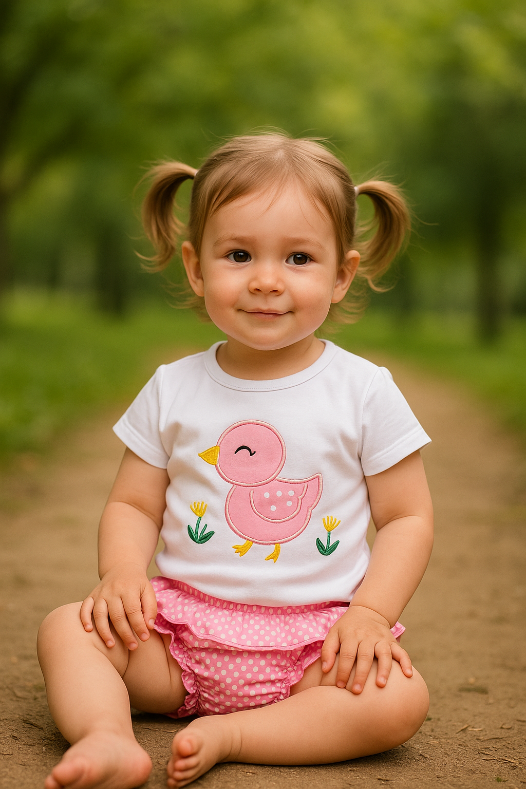Precioso conjunto baño de niña, camiseta de manga corta, cuello redondo y una precioso patito en rosa, en el centro de la camiseta.