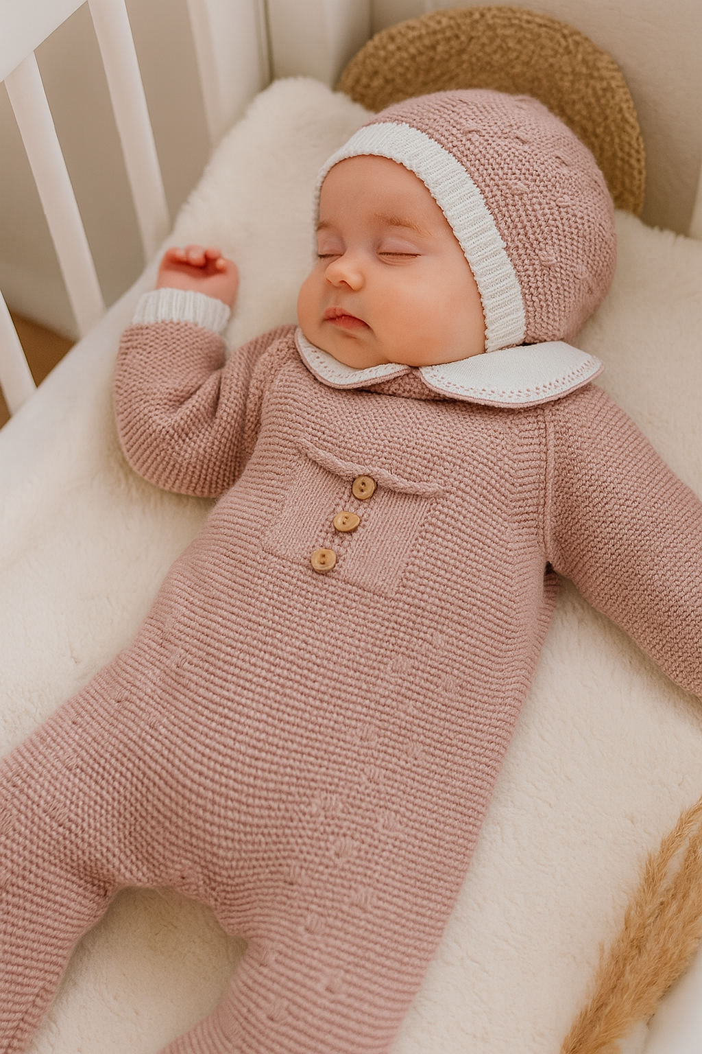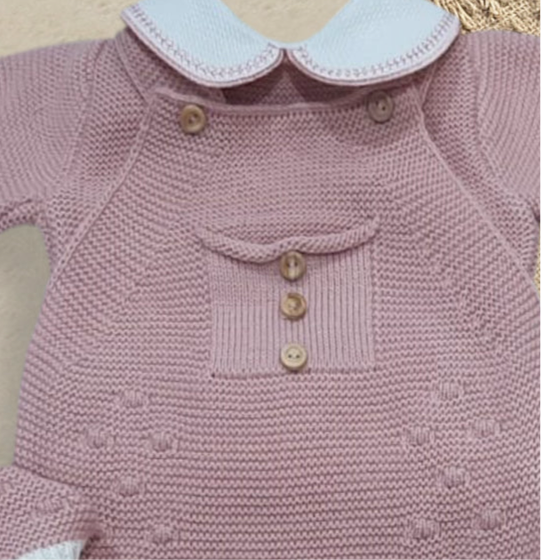 Conjunto peto de primera puesta, de tres piezas en color rosa viejo, el suéter con cuello bebé en blanco y peto de tirantes y capota del mismo tono.