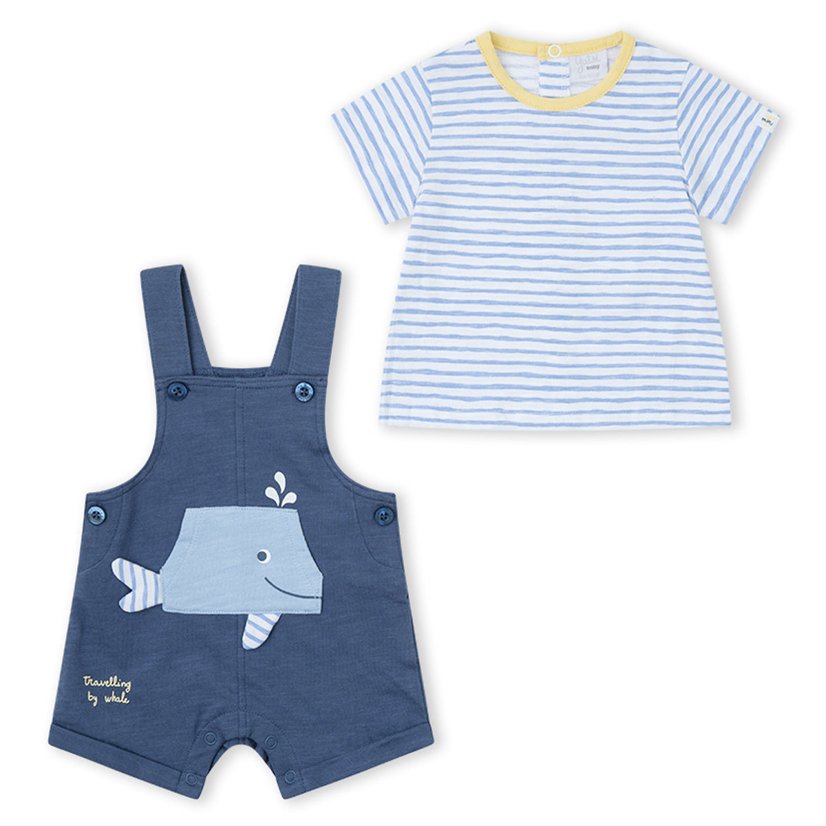 Este es un encantador conjunto de dos piezas para bebé con un estilo clásico y veraniego: