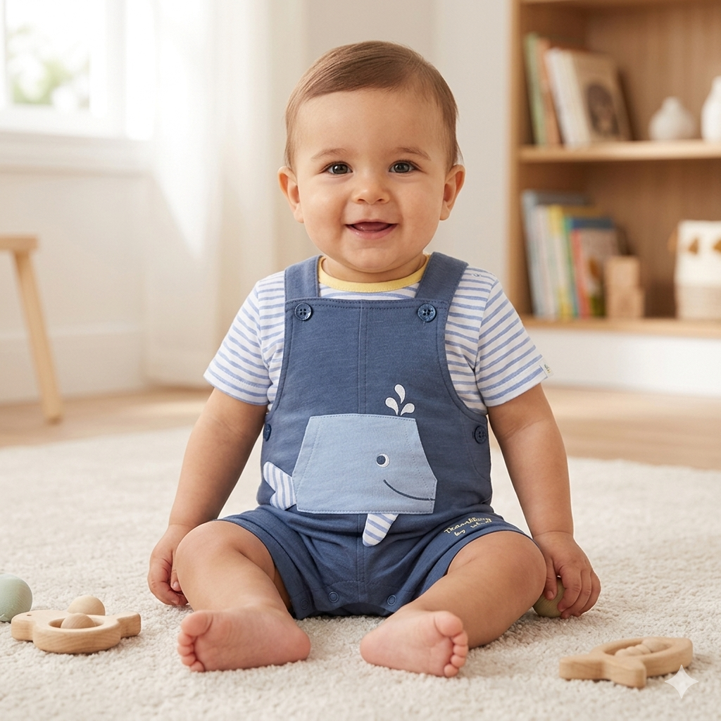 • Peto de tirantes en color azul marino con una simpatía bañera en el centro..