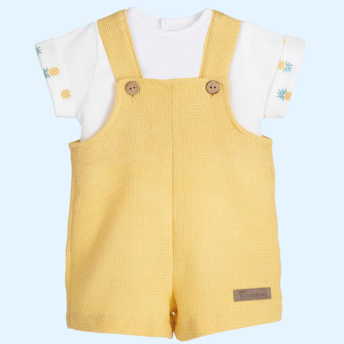 Conjunto de peto en color mostaza y camiseta blanca con de niño, de la Colección Gaya Calamaro