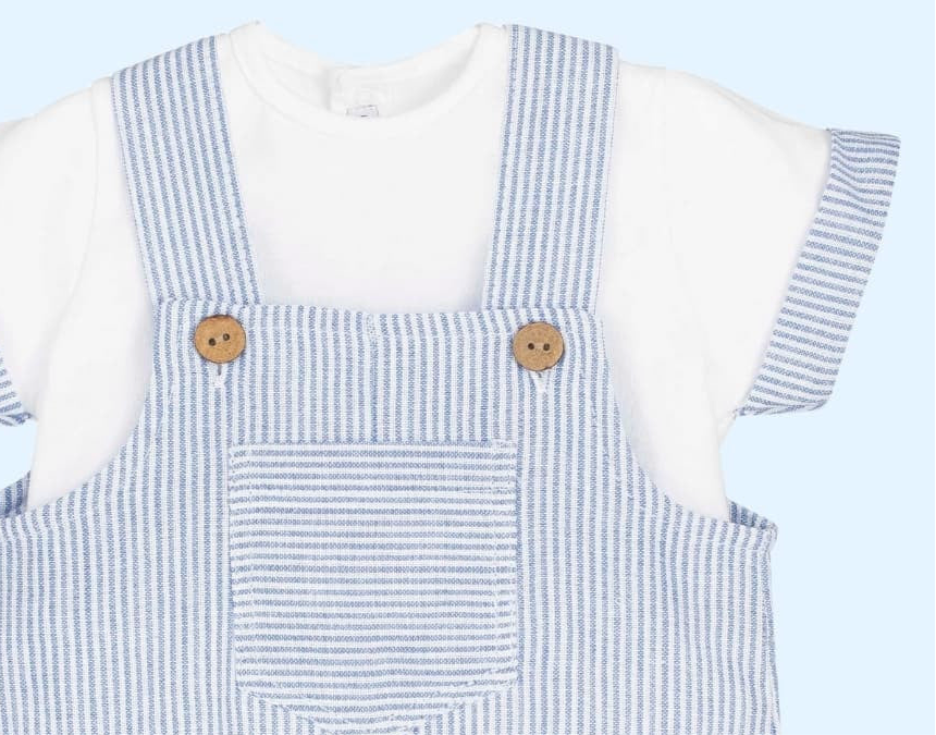 Peto esta confeccionado en un tejido de milrayas en azul claro y blanco, un clásico de la moda infantil de verano. Incluye tirantes sujetos por dos botones de aspecto amaderado y un pequeño bolsillo decorativo en el centro del pecho.