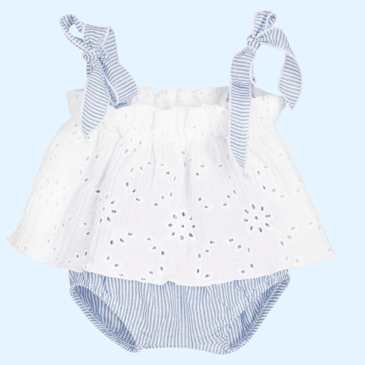 • Pololo (Parte inferior): Es una braguita o cubrepañal a juego con el mismo estampado de rayas azules y blancas de los tirantes. Cuenta con elásticos en las piernas para un ajuste cómodo.