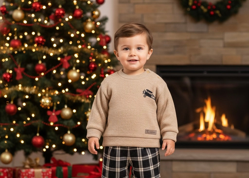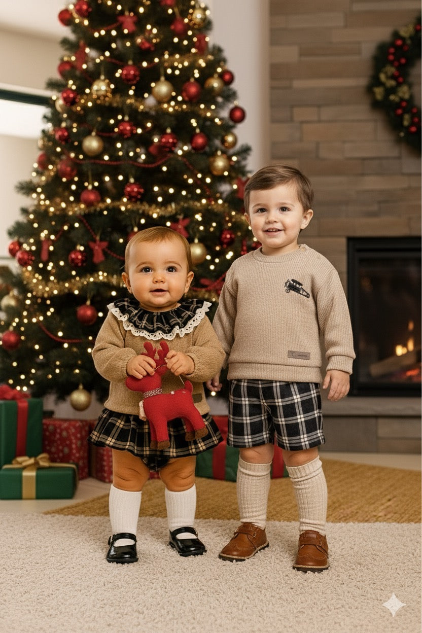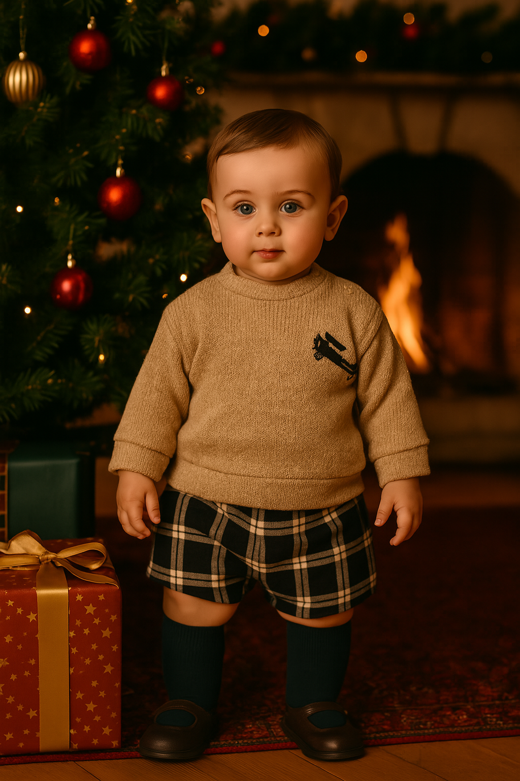 Este conjunto combina elegancia y comodidad para los más pequeños. El jersey de punto en tono beige suave presenta un delicado bordado de avioncito vintage en el pecho, aportando un toque nostálgico y encantador. El pantalón corto de cuadros en blanco y negro completa el look con estilo clásico y versátil.