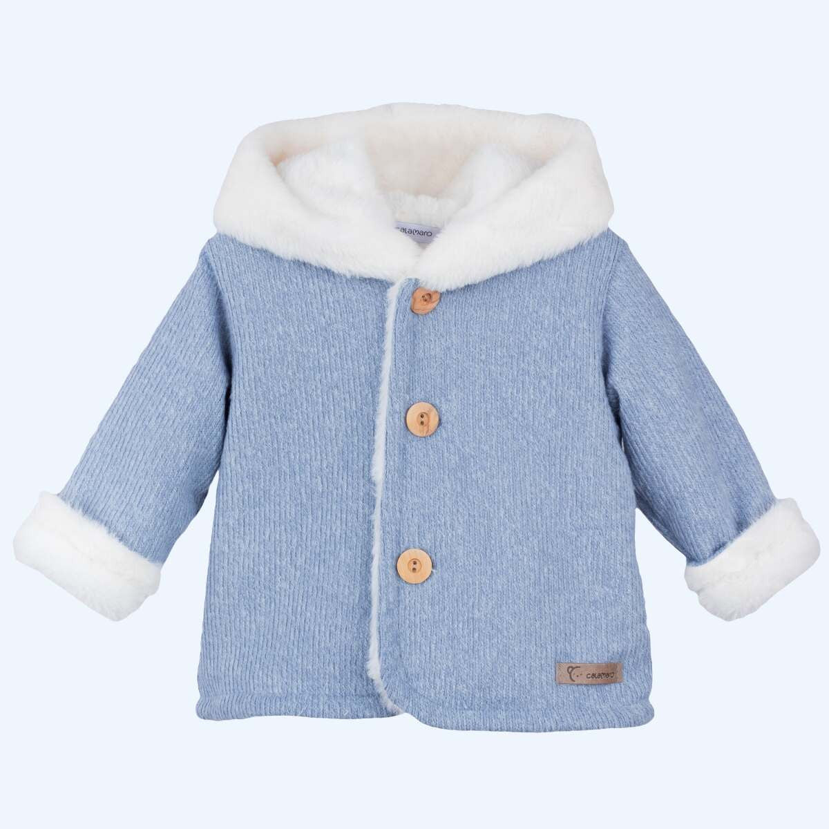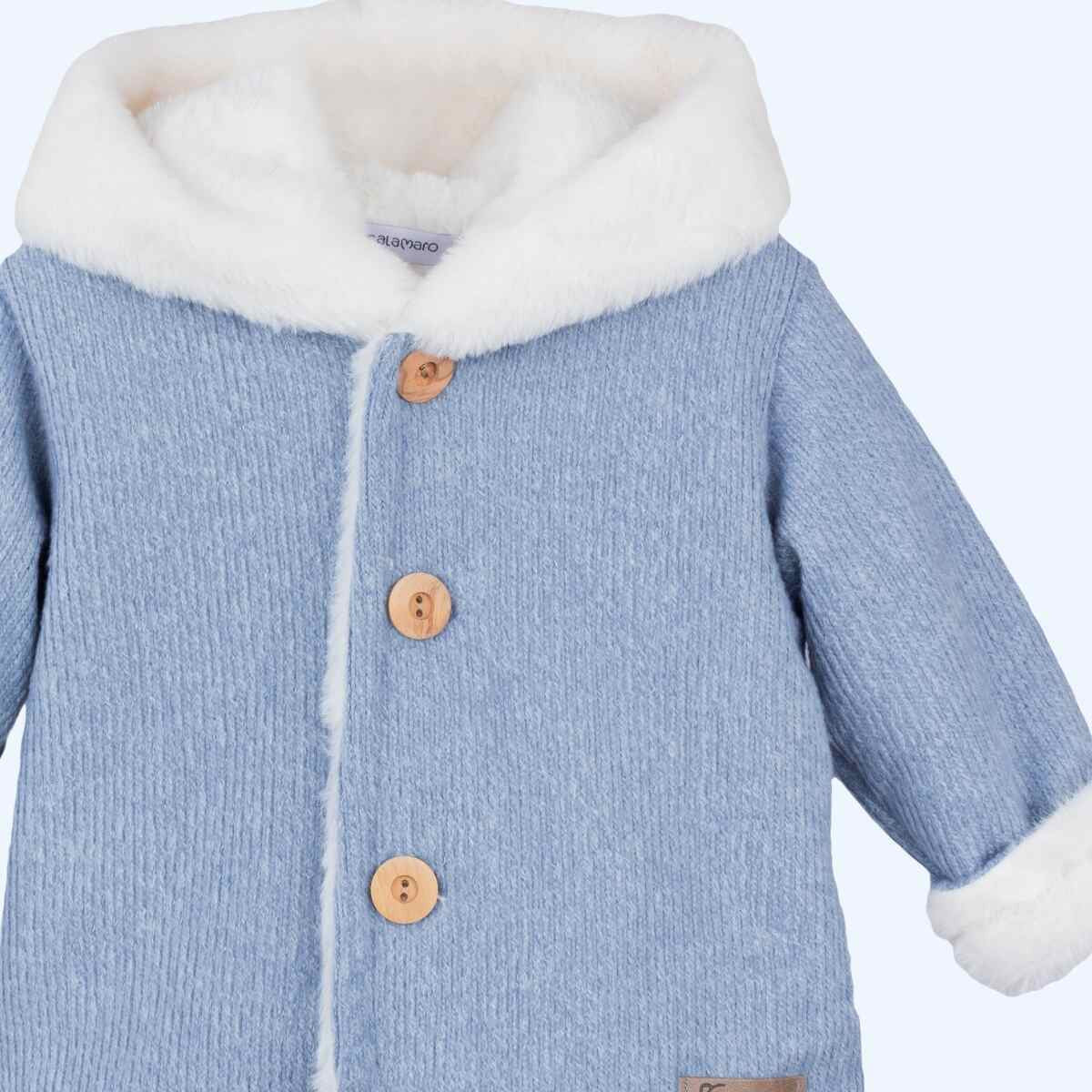 Precioso abrigo de punto en azul, que combina estilo y comodidad para los más pequeños. Cuenta con un forro interior de pelito blanco súper suave, dispone de capucha forrada, botones de madera ideal para mantener a tu peque calentito en los días fríos.