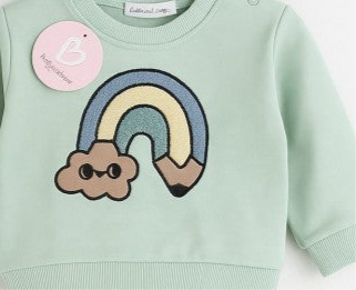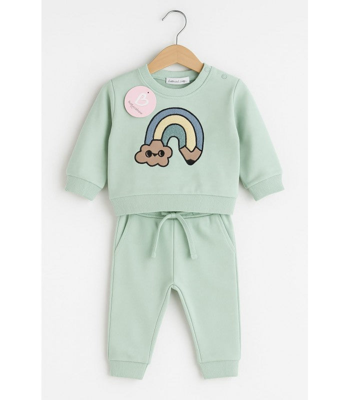 La pieza central es la sudadera con un divertido bordado/aplique de un arcoíris sobre una nube sonriente con gafas, añadiendo un toque de alegría y originalidad. Es la opción ideal para el día a día, la guardería o para sus primeros paseos.