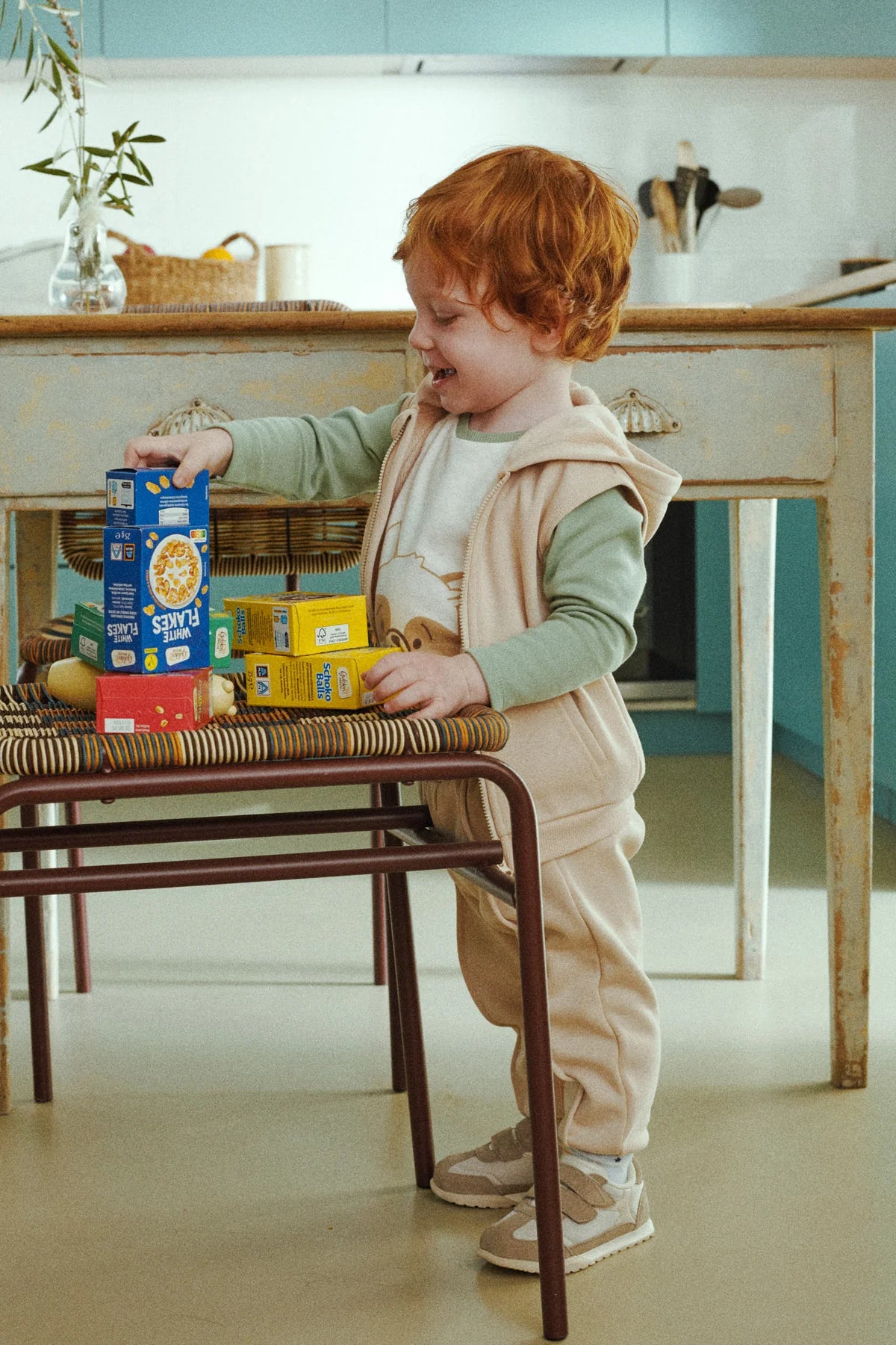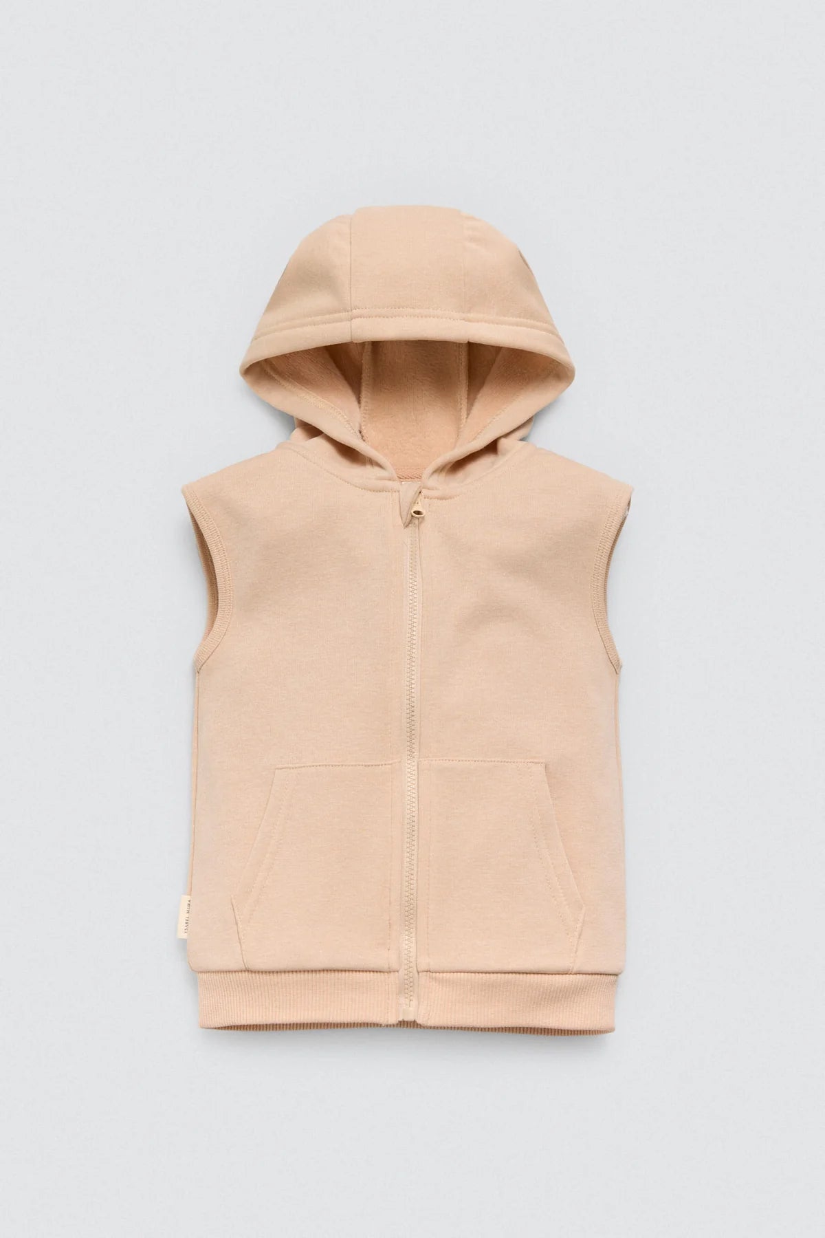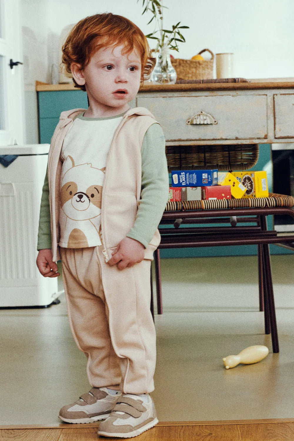 Conjunto de bebé para otoño compuesto por camiseta de manga larga con dibujo de zorro, pantalón largo y chaleco afelpado. Elaborado en algodón natural con interior afelpado suave, ideal para mantener al bebé abrigado.