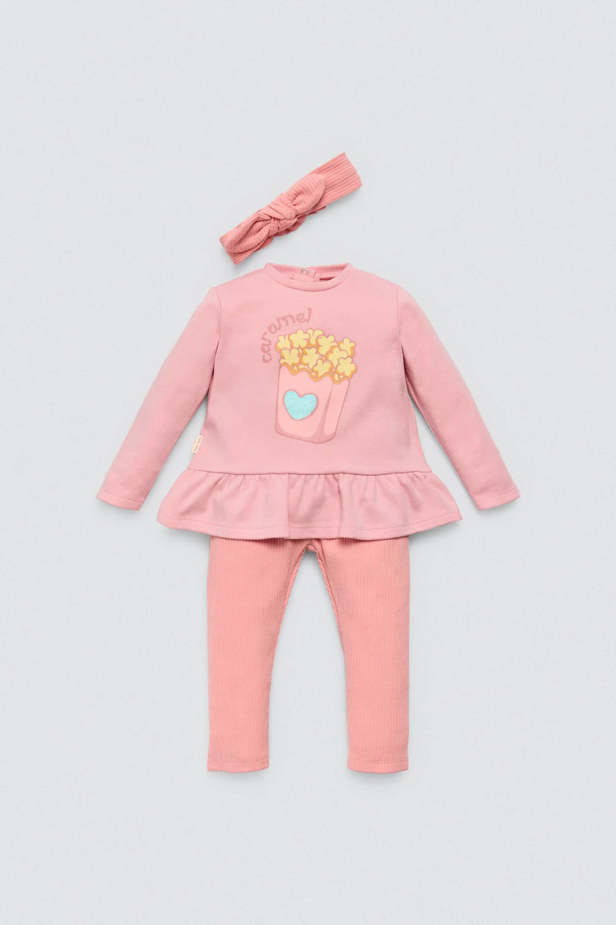 Set de bebé compuesto por camiseta, pantalón y banda de pelo . Interior afelpado. Diseño de la colección Candy Circus en tono rosa pastel con detalles dulces. Algodón natural, ideal para regalar o para los primeros meses.