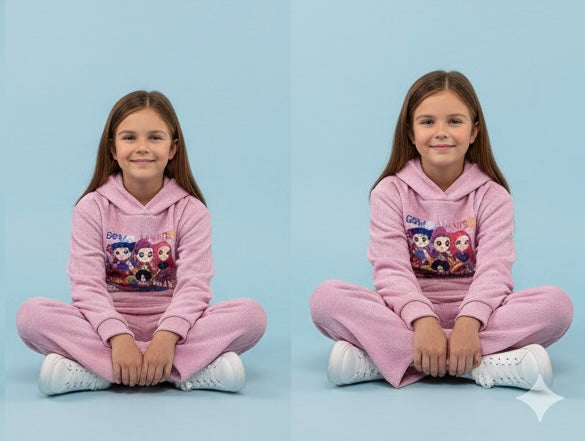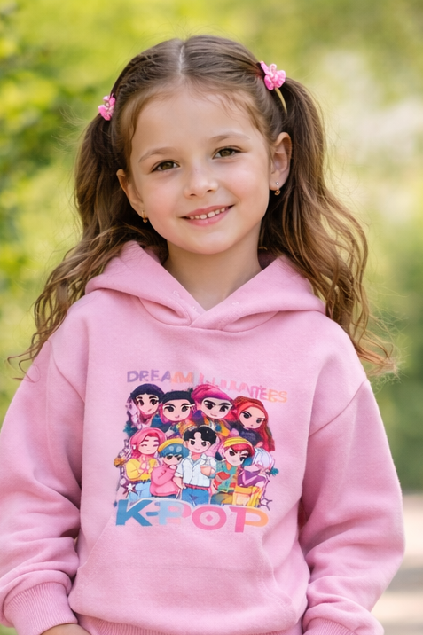 Chandal de niña en rosa, tejido tipo micropana, sudadera con capucha y con los dibujos de las guerreras K-Pop y pantalón en el mismo tono rosa..