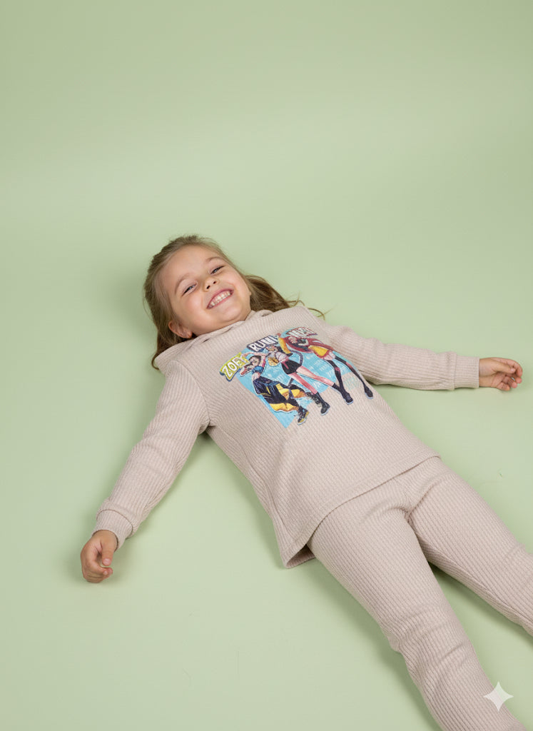Chandal de niña con sudadera y leggins, en beige, con tejido tipo micropana muy suave con los personajes de K-Pop Da poca talla.