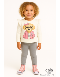 Conjunto de niña, con camiseta en blanco roto con cuello redondo, volantes en los hombros y dibujo de una simpática perrita 🐶 y leggins en color gris, sin pelito