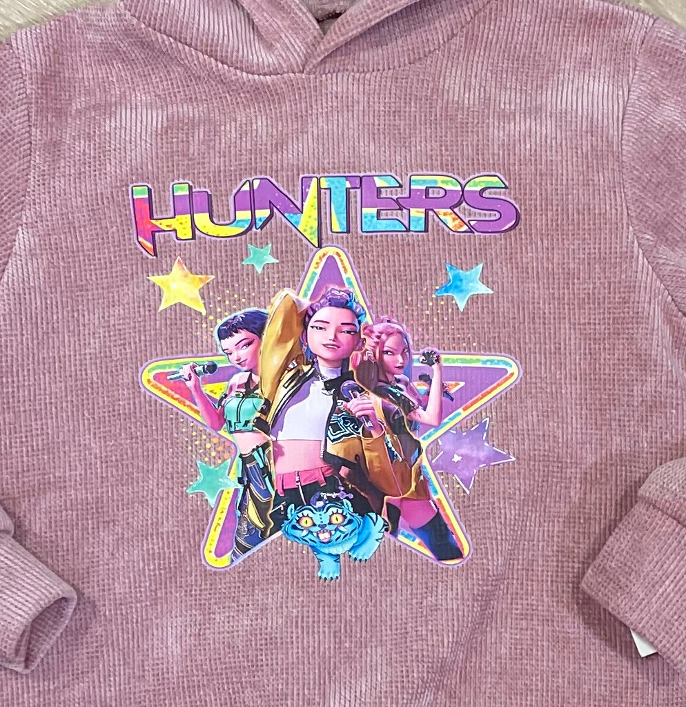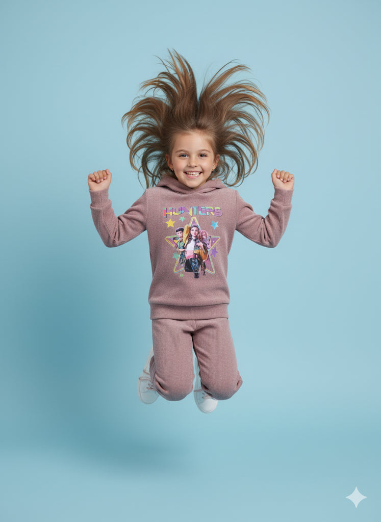 Chandal de niña con sudadera con capucha y pantalón, en color rosa maquillaje, con tejido tipo micropana muy suave con los personajes de K-Pop