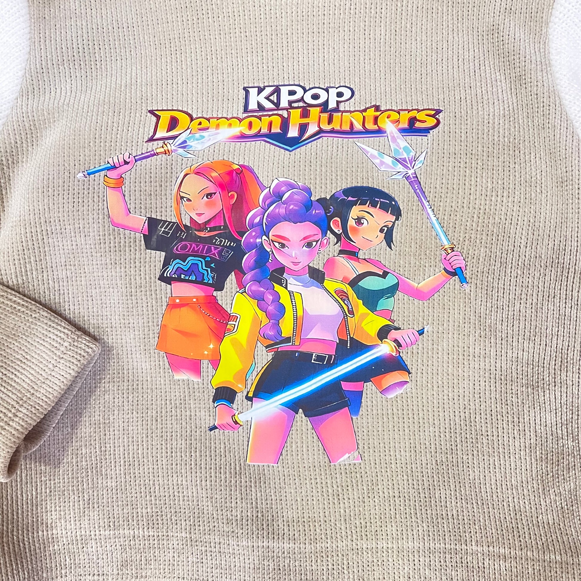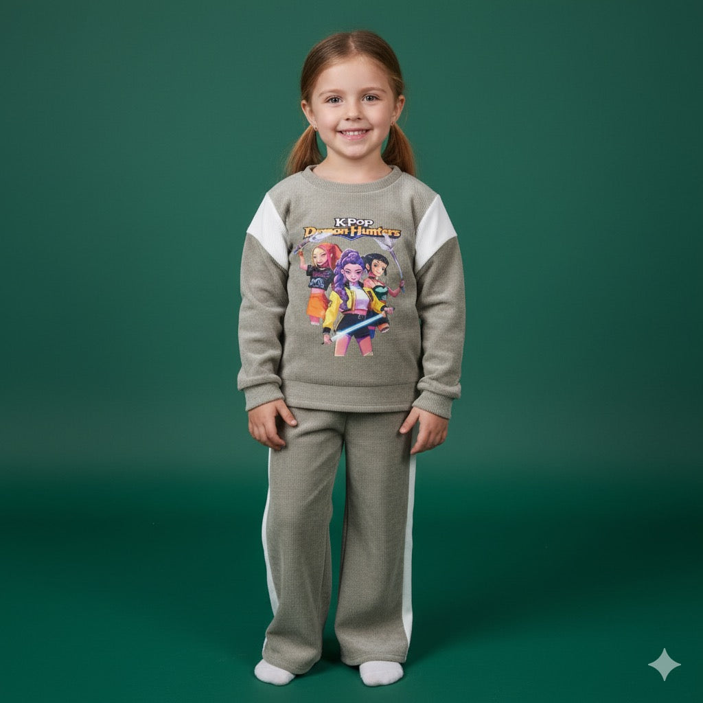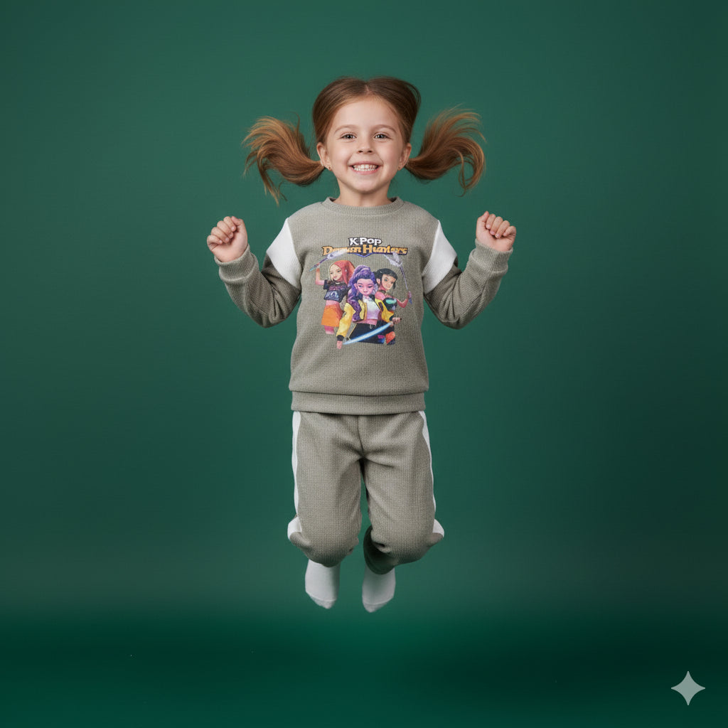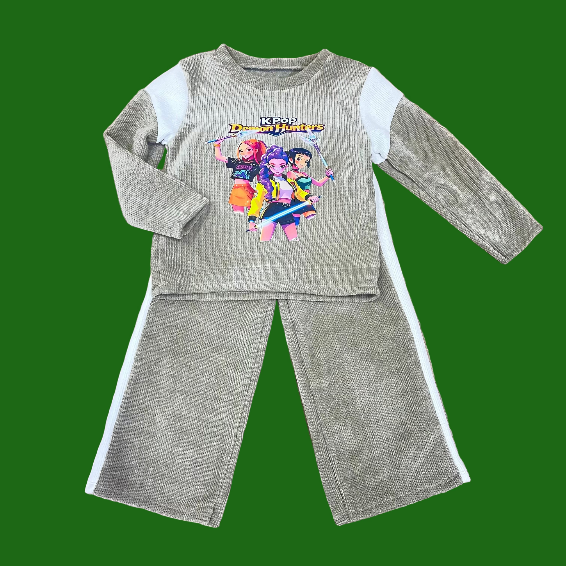 Chandal de niña con sudadera y pantalón, en color rosa viejo, con tejido tipo micropana muy suave con los personajes de K-Pop