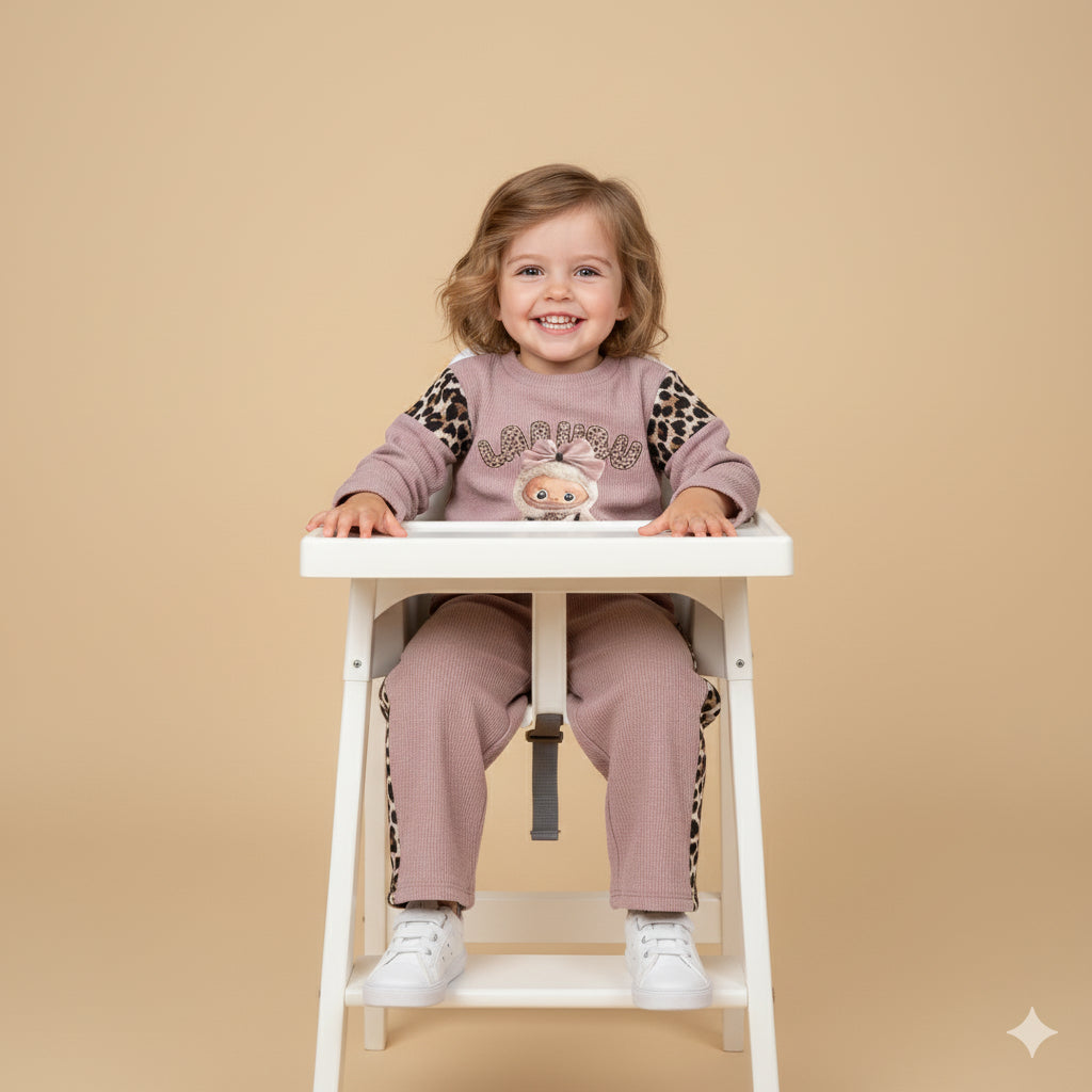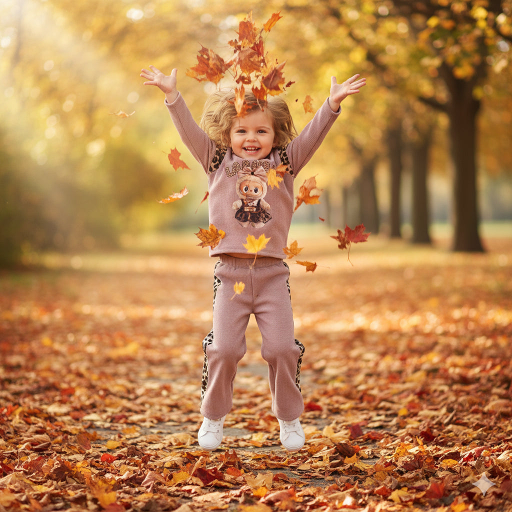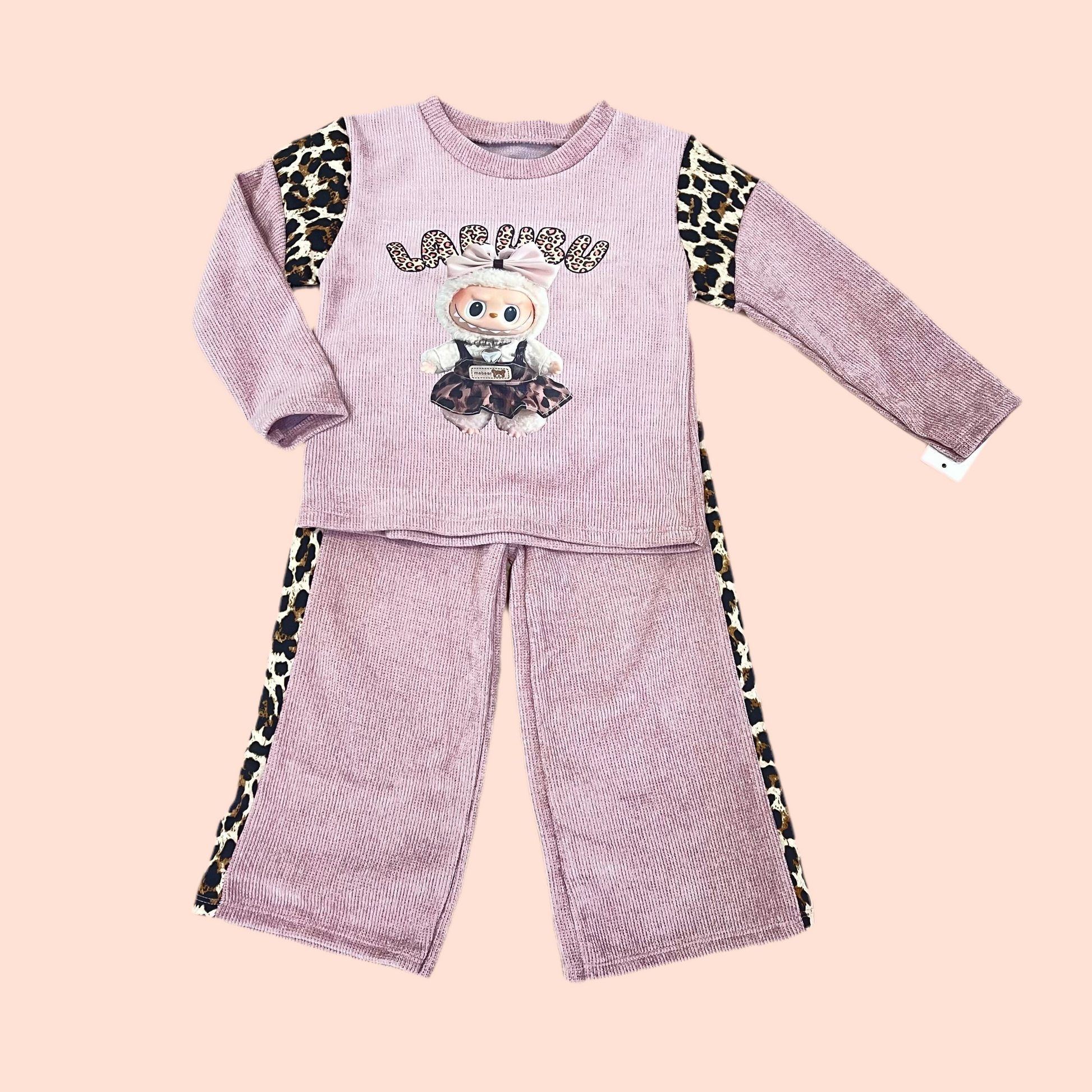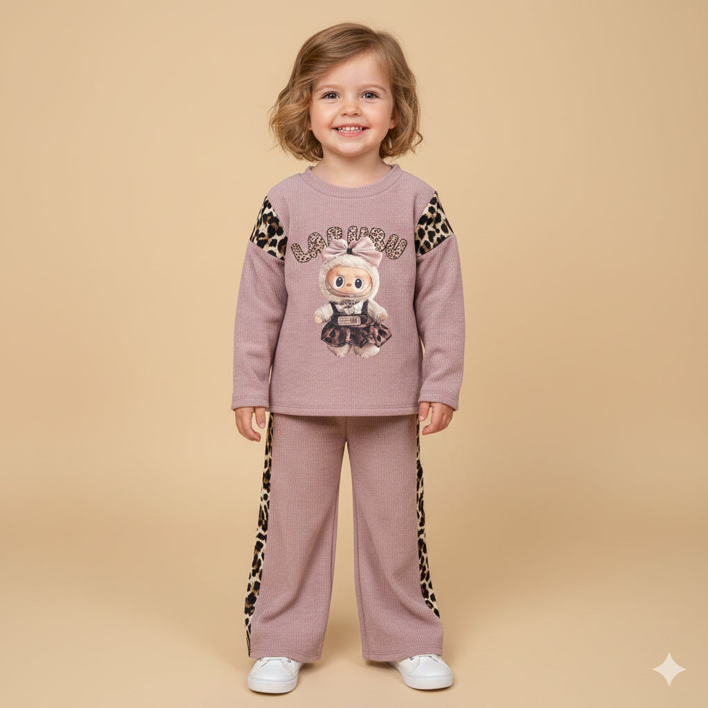 Chandal de niña con sudadera y pantalón, en color rosa viejo y tejido tipo micropana suave y muy elástico, con los personajes de Labubu
