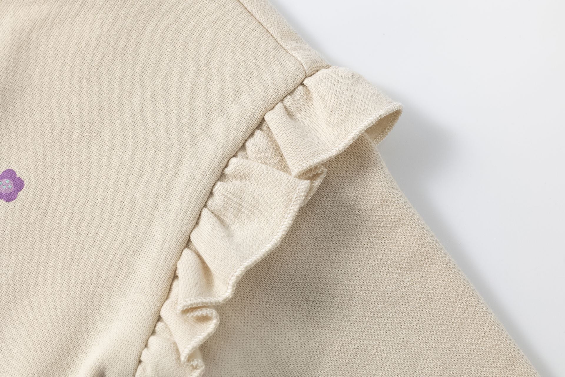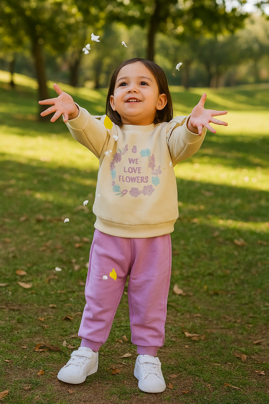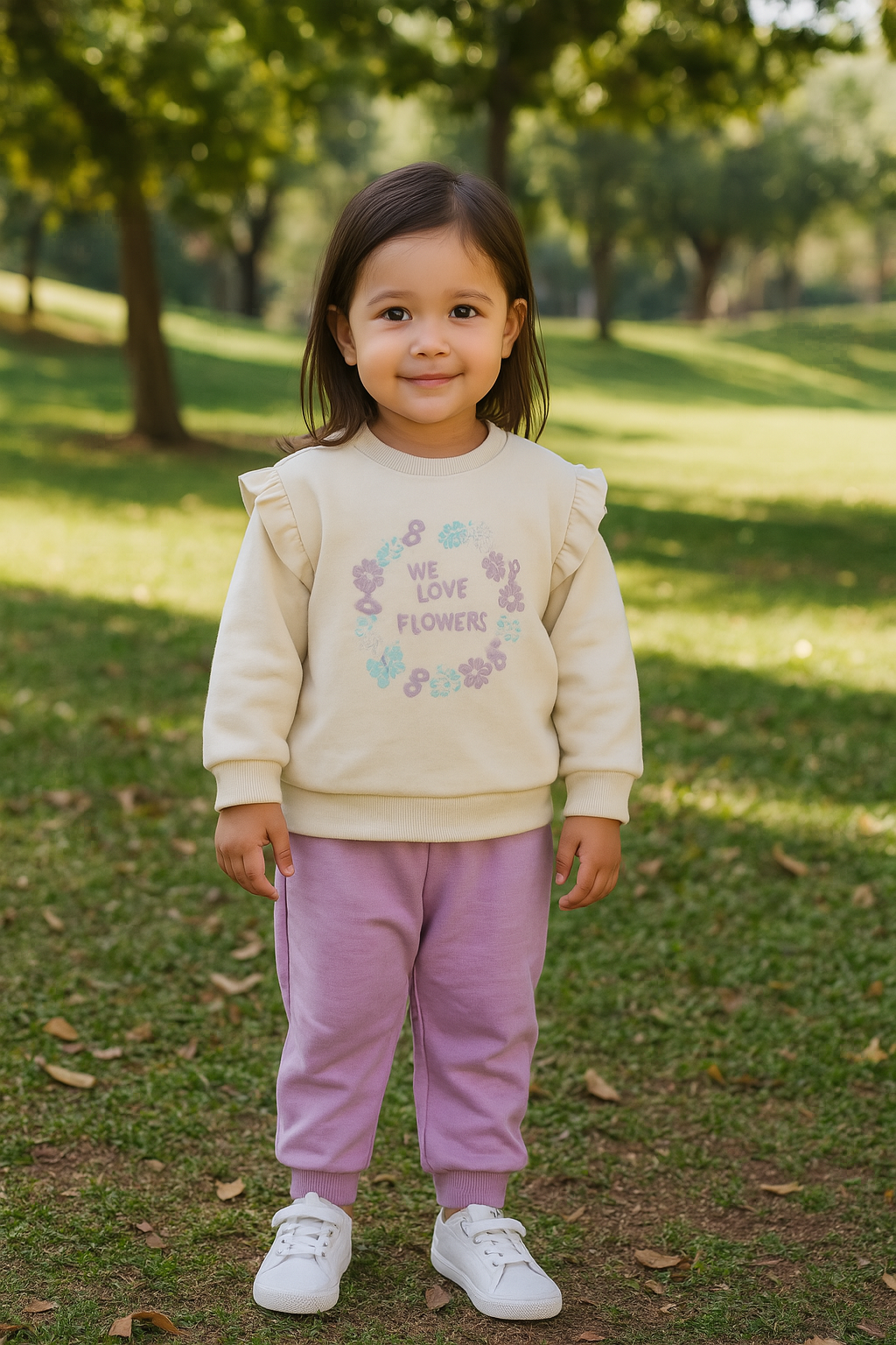 🎀 Conjunto jogging y sudadera con volantes a tono en hombros, estampado flores en relieve en la parte delantera, botón el la parte trasera, con pantalón del color morado. Cintura con goma