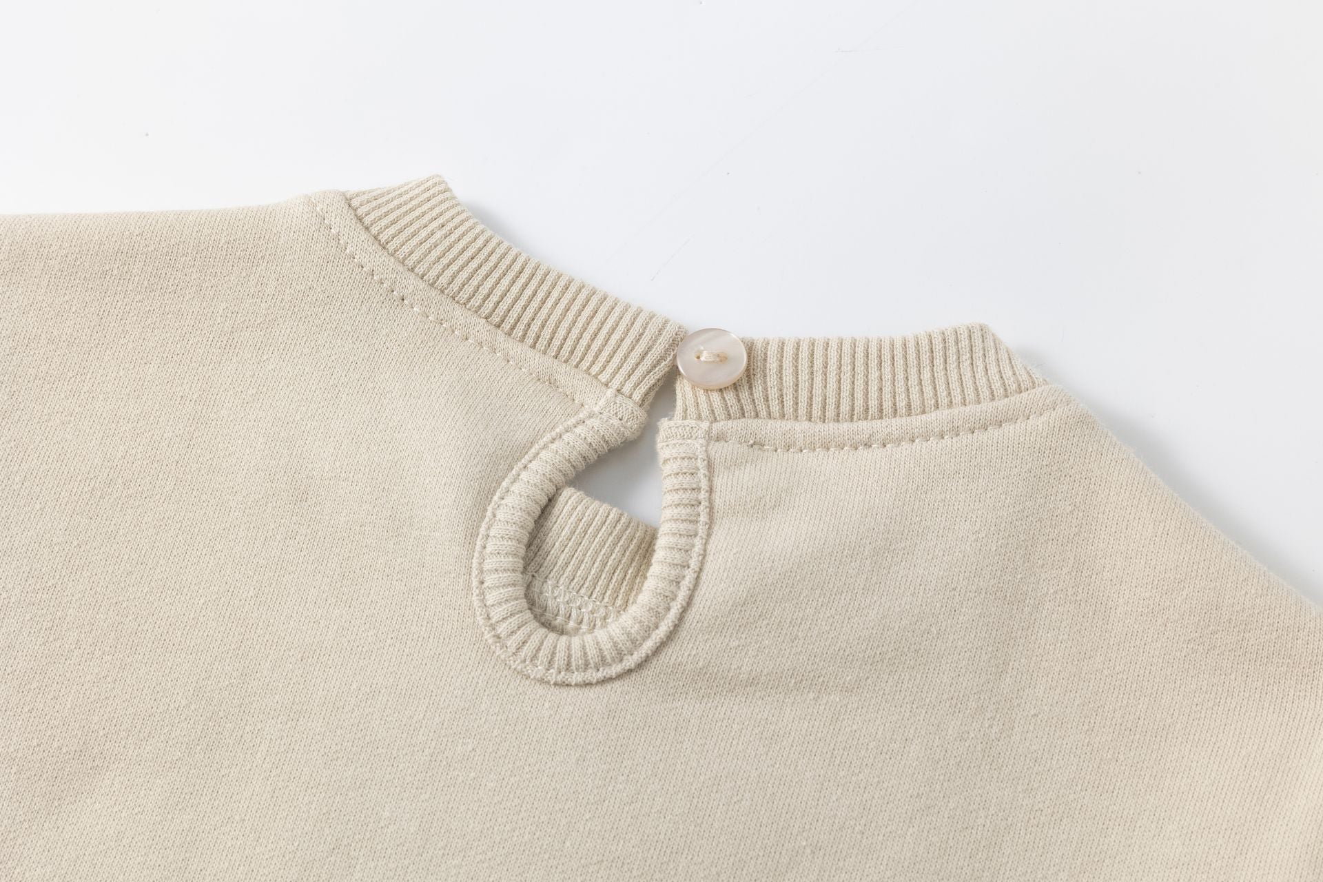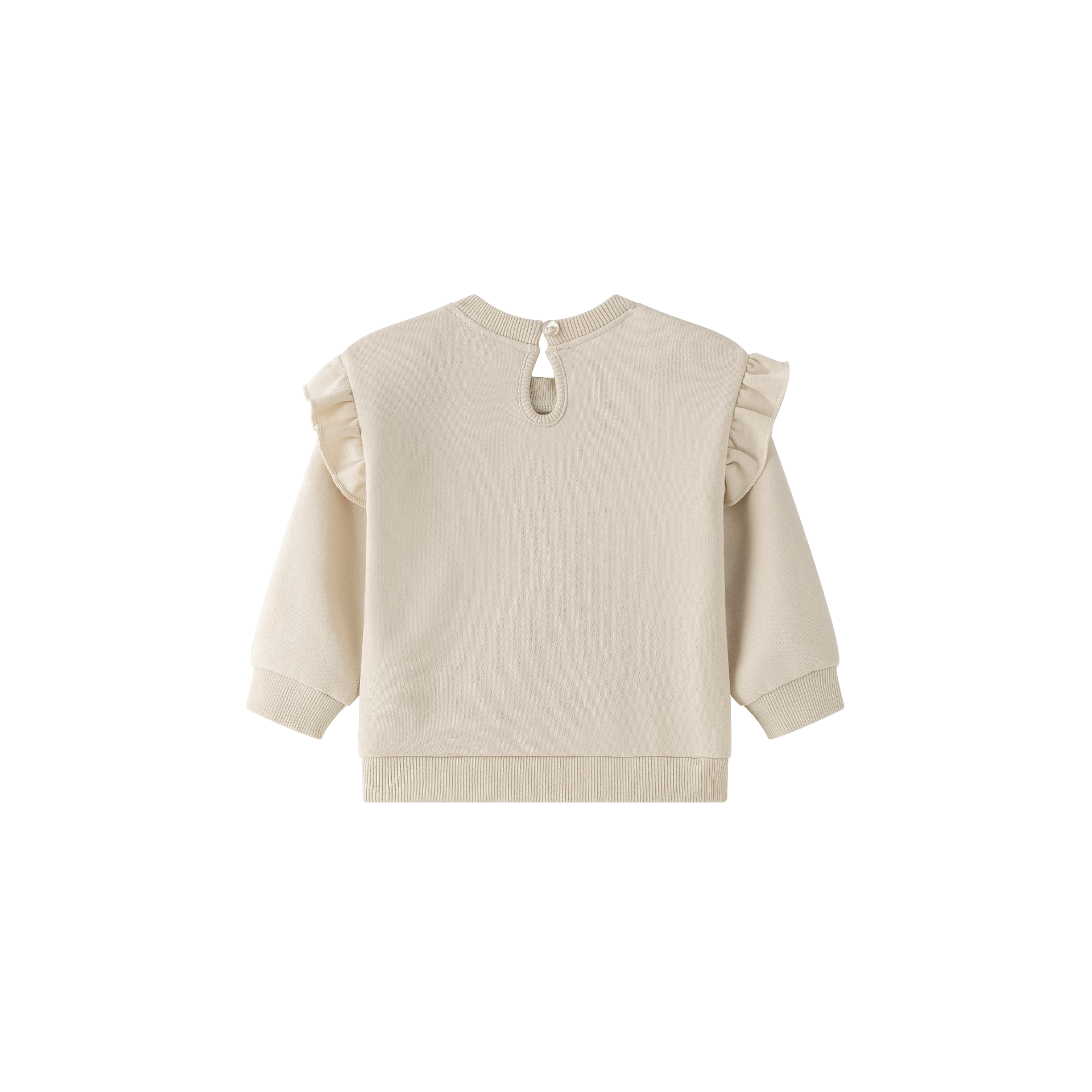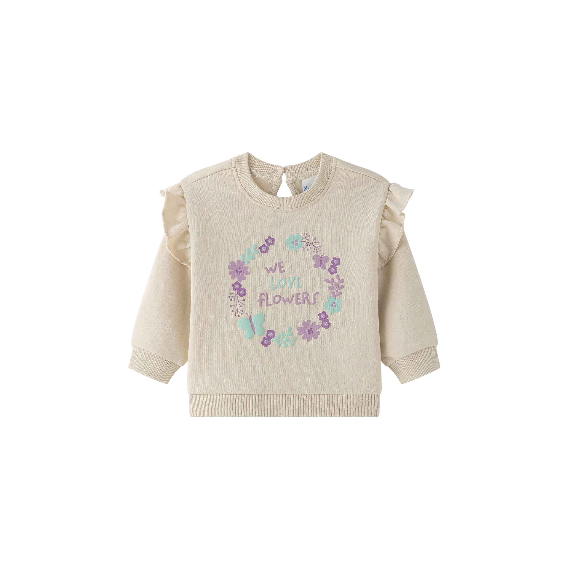 🎀 Conjunto jogging y sudadera con volantes a tono en hombros, estampado flores en relieve en la parte delantera, botón el la parte trasera, con pantalón del color morado. Cintura con goma
