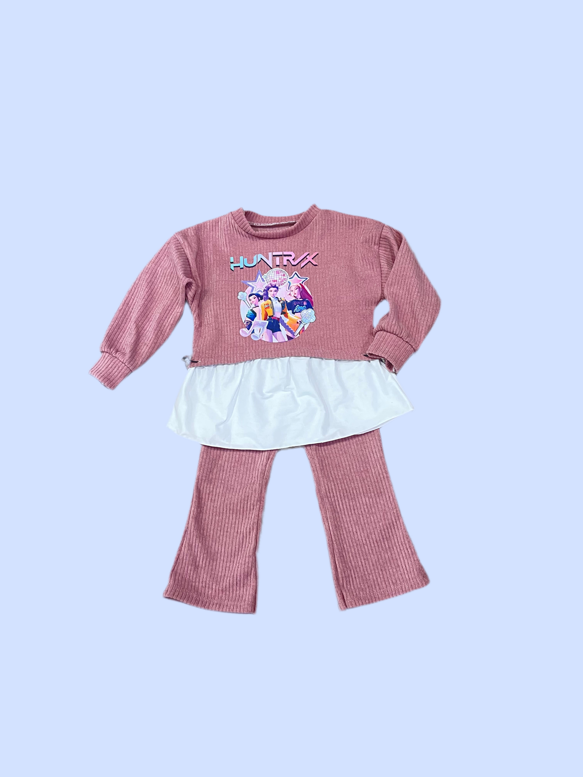 Chandal de niña en rosa, tejido tipo micropana, sudadera sin capucha y volante blanco simulando una camisa, con los dibujos de las guerreras K-Pop y pantalón en el mismo tono rosa..