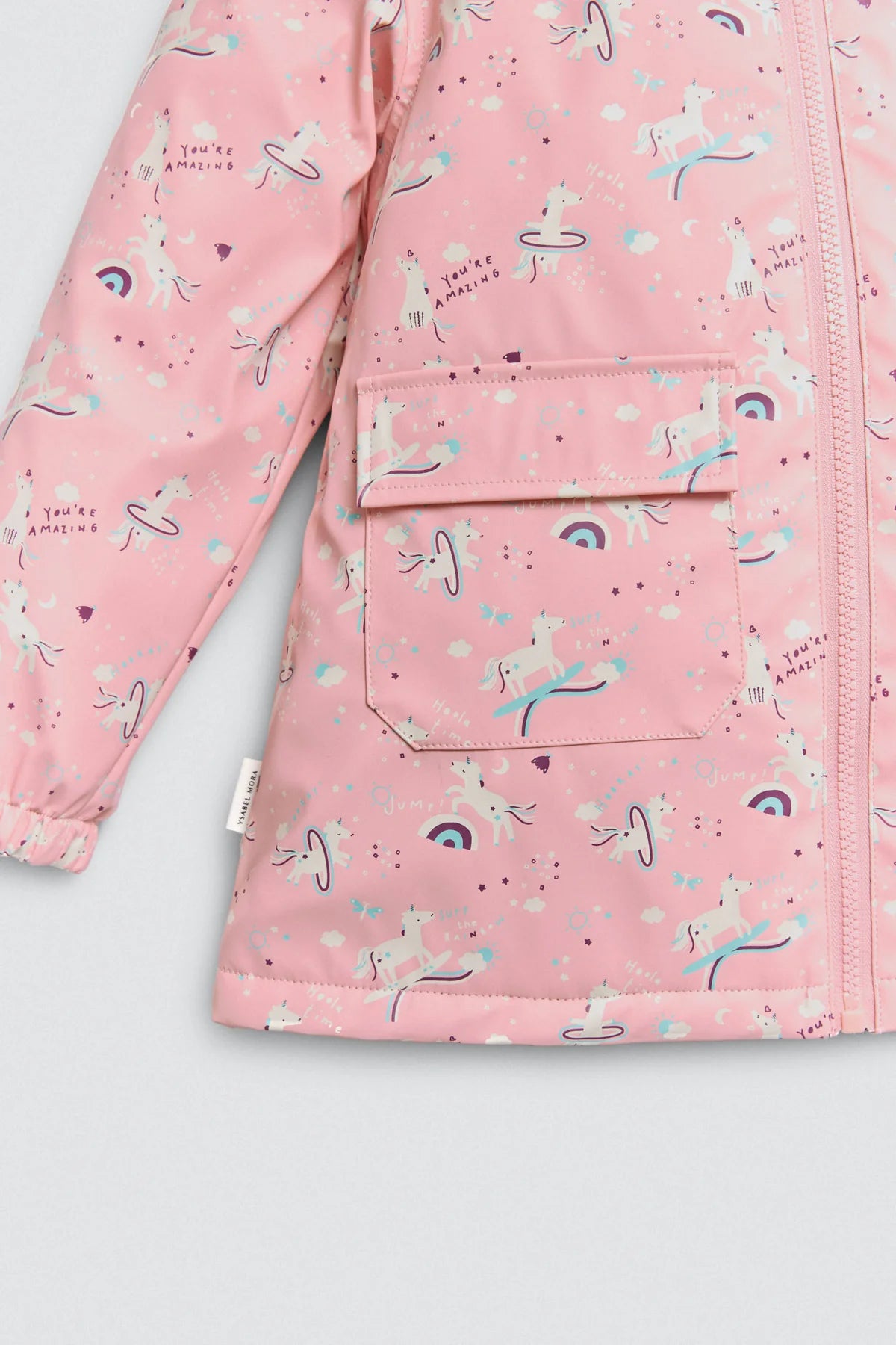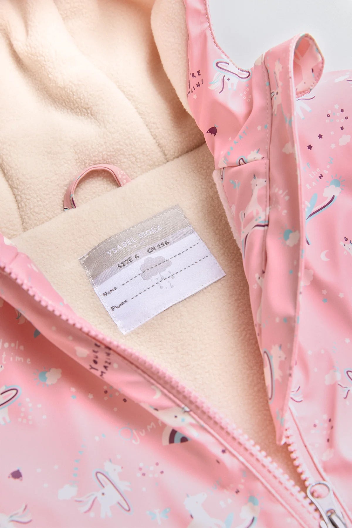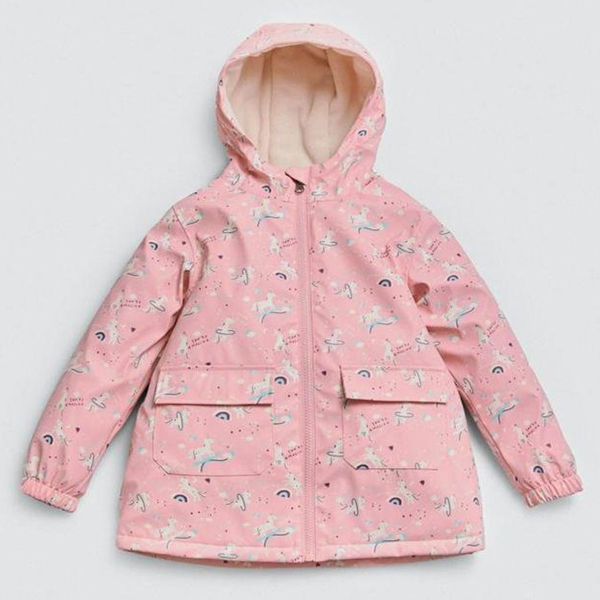 Este chubasquero infantil es perfecto para aventuras bajo la lluvia. Con un suave interior afelpado polar, capucha y prácticos bolsillos delanteros. El tejido exterior es engomado y repelente al agua. Mantiene a los niños abrigados y secos en los días fríos de lluvia. El emocionante diseño “de unicornios” les invita a explorar nuevos mundos mientras se mantienen protegidos. Con cierre de cremallera para mayor comodidad, ¡este chubasquero es ideal para pequeños exploradores!.