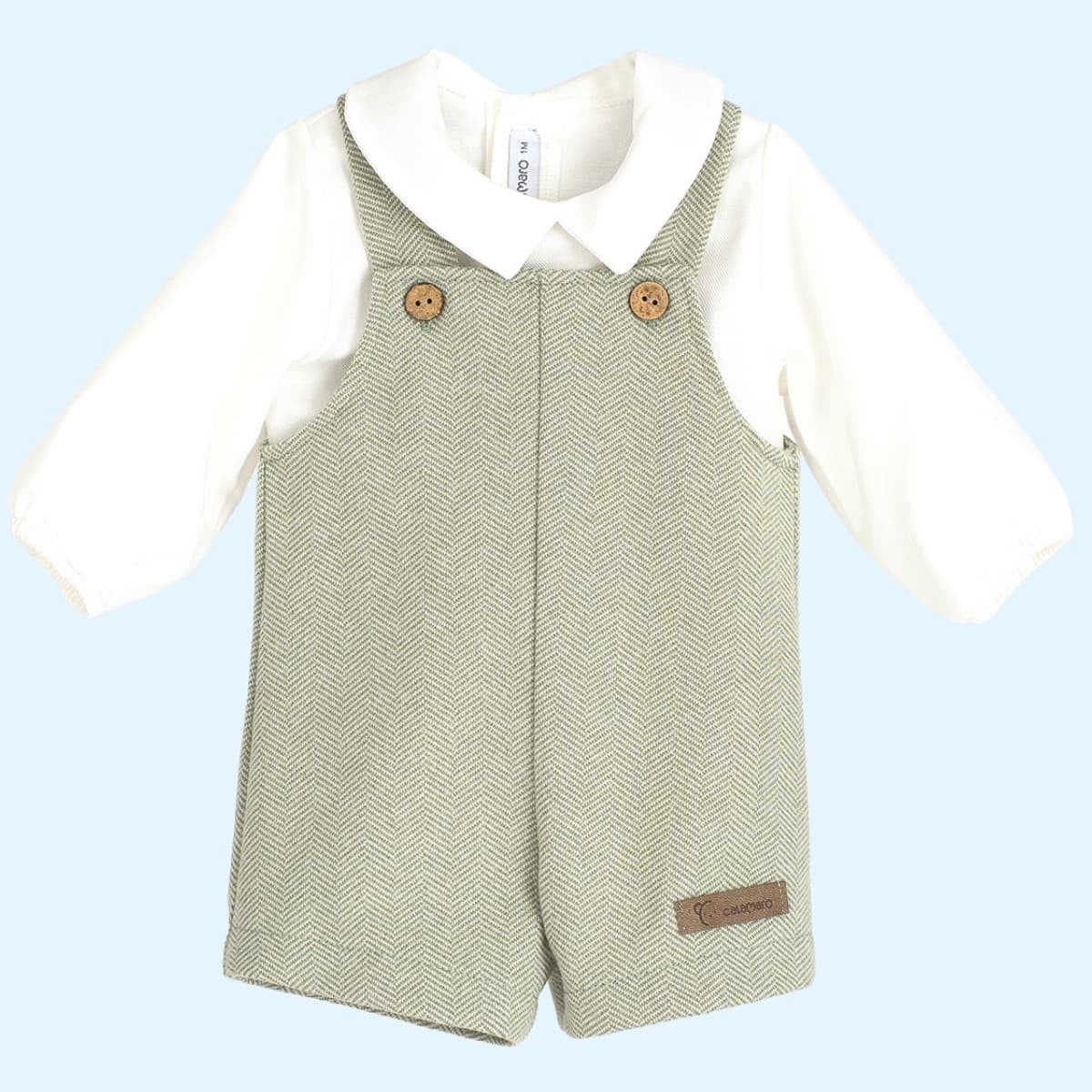 Conjunto de bebé, compuesto por camisa blanca y peto verde, ideal para vestir niño bebé