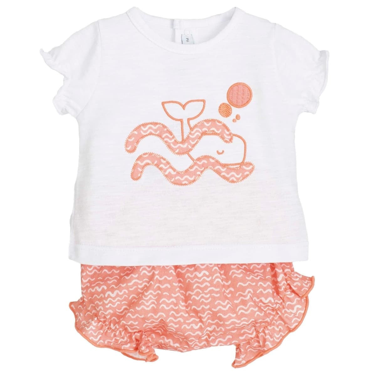 camiseta de color blanco con manga corta, presenta una aplicación bordada de una ballena y burbujas en tono coral. El cuerpo de la ballena está relleno con un patrón de líneas onduladas blancas que simulan el movimiento del mar. Incluye botones de presión en la parte posterior del cuello para facilitar el vestir al bebé.