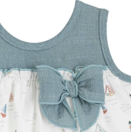 El diseño sin mangas incorpora un canesú en color azul empolvado y un lazo decorativo en un lado, ideal para este verano