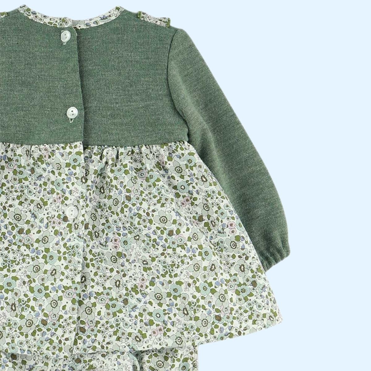 Jesusito de niña, talle alto, la parte de arriba es color verde, con un volante en la parte delantera decorativo con lazo y La parte de abajo del vestido es estampado de flores en tonos verdes y braguitas con el mismo estampado, abotonado por detrás.