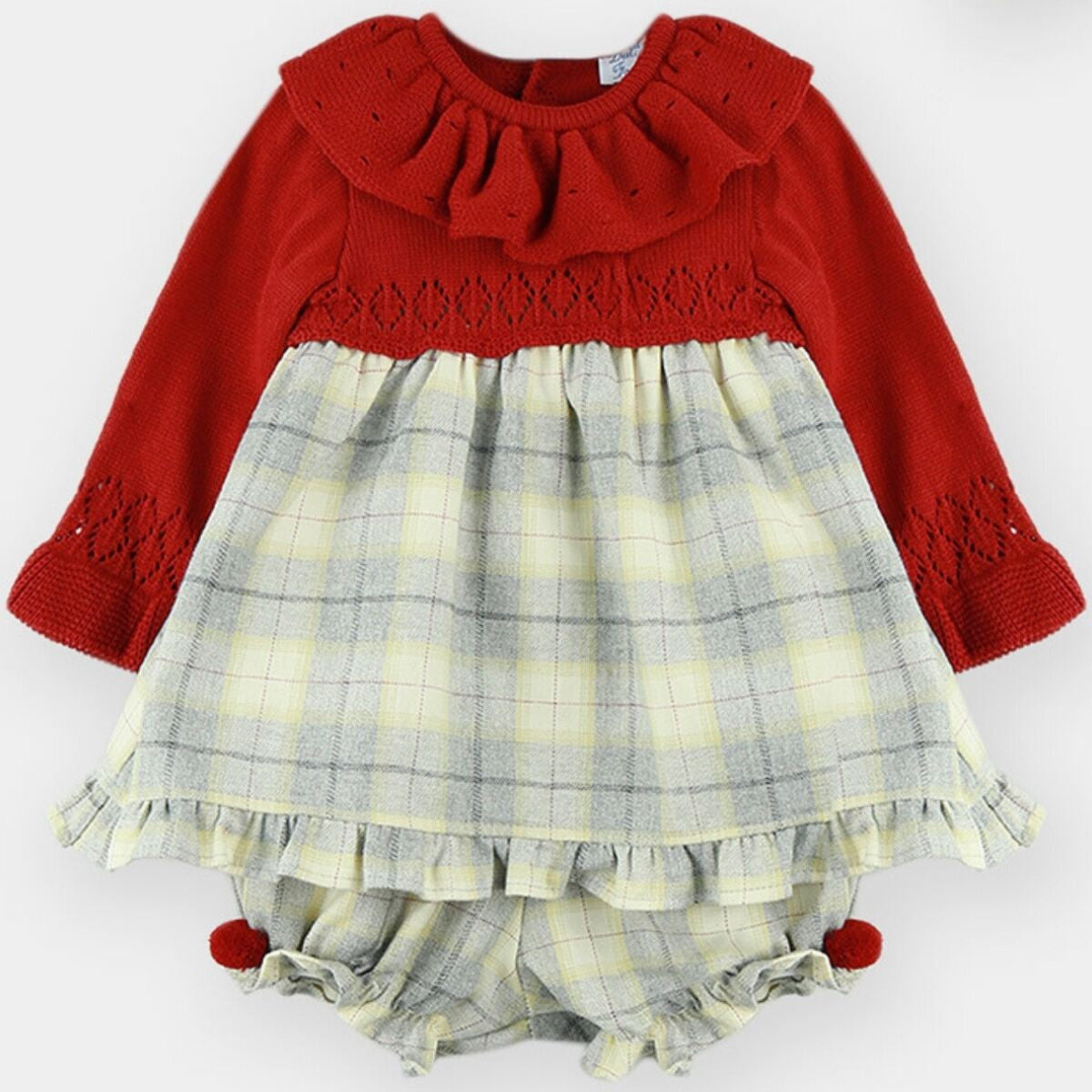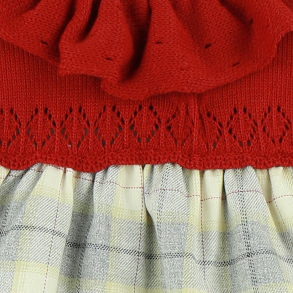 Vestido de niña bebé, cuerpo en lana en rojo, cuello redondo con puntilla en lana, y falda estampada en cuadros y capota en lana roja y cubre pañal en cuadros con un pompón rojo a cada lado