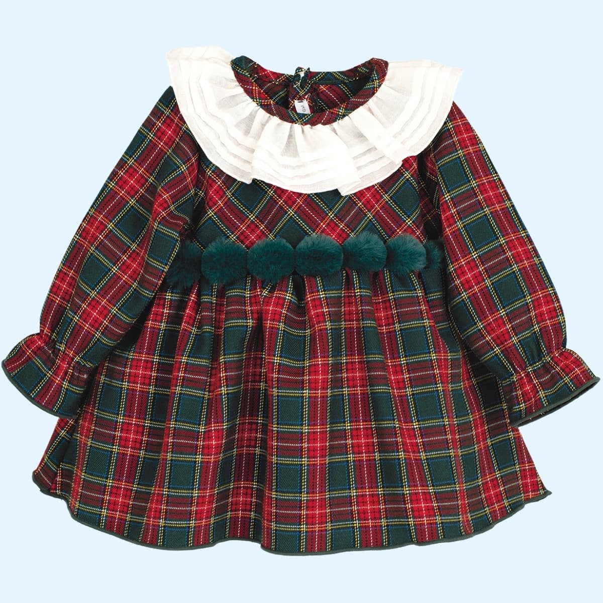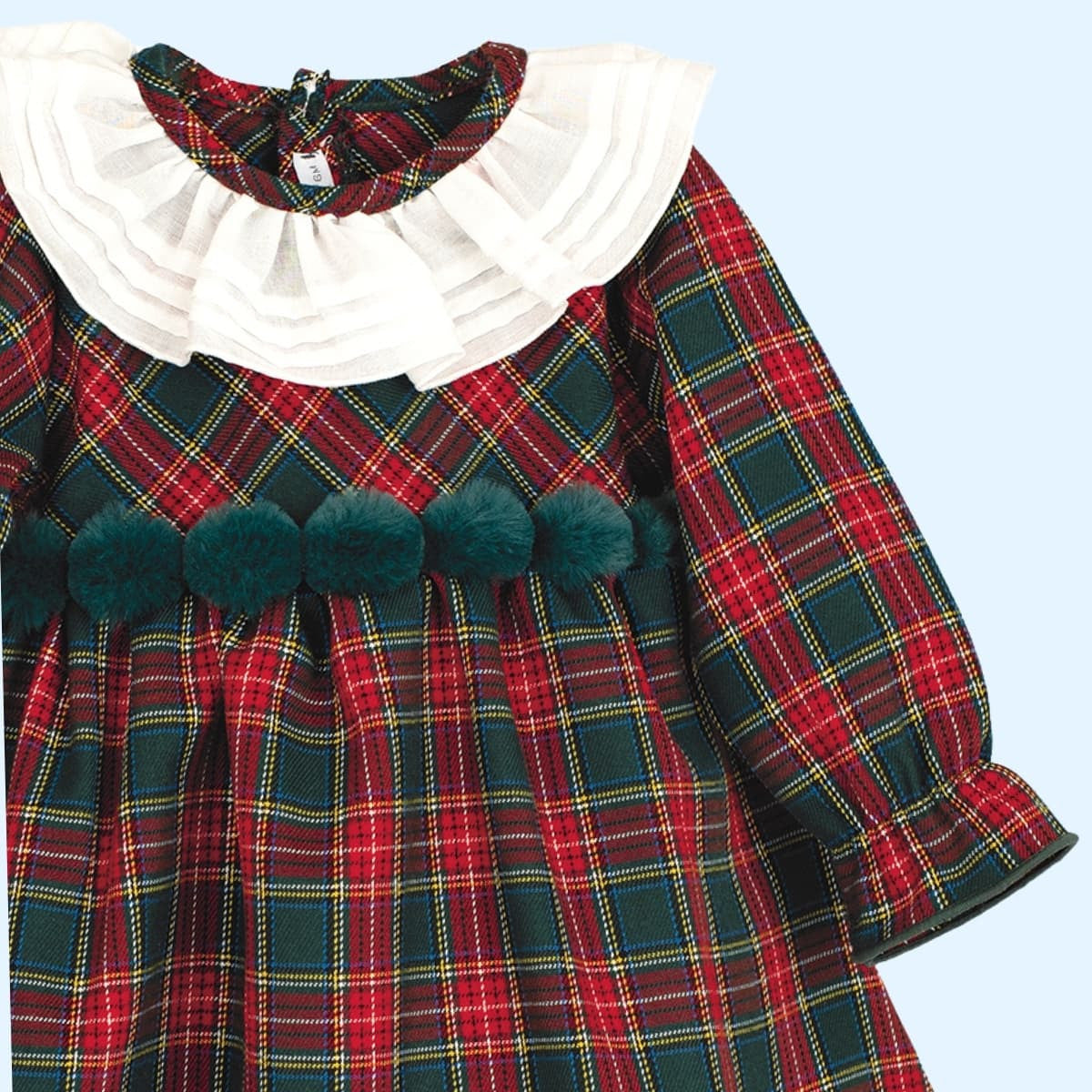Confeccionado con un precioso tejido de cuadros, con volante blanco y unos preciosos pompones en verde botella.
