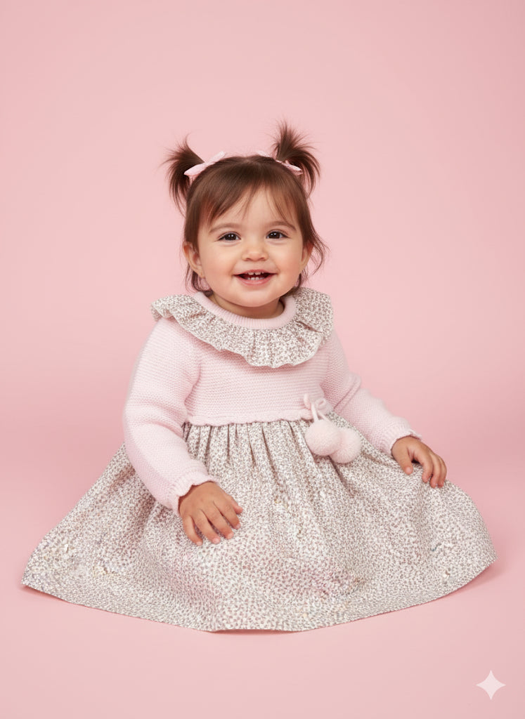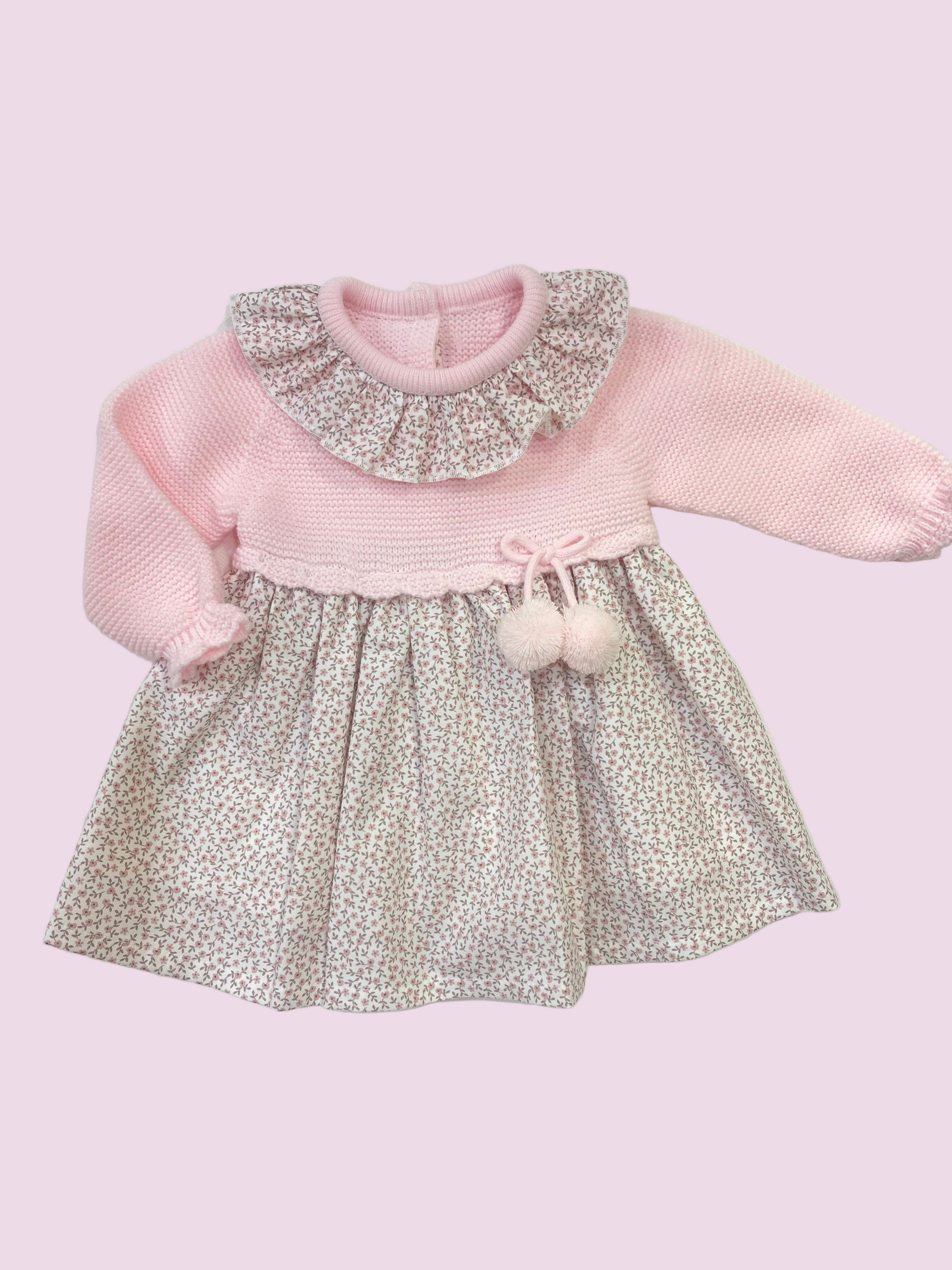 Vestido de bebe, la parte superior es de punto con pompones decorativo y cuello redondo con volante estampado, la zona inferior es de tela estampada de florecitas.