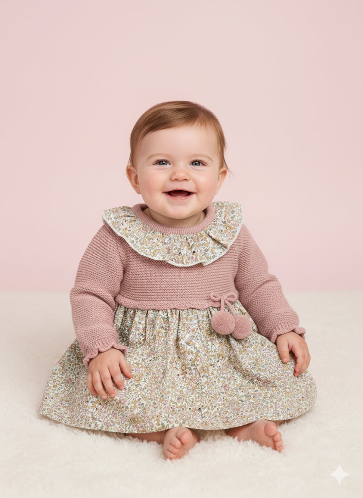 Vestido de bebe, la parte superior es de punto con pompones decorativo y volante en el cuello , la zona inferior es de tela estampada de florecitas.