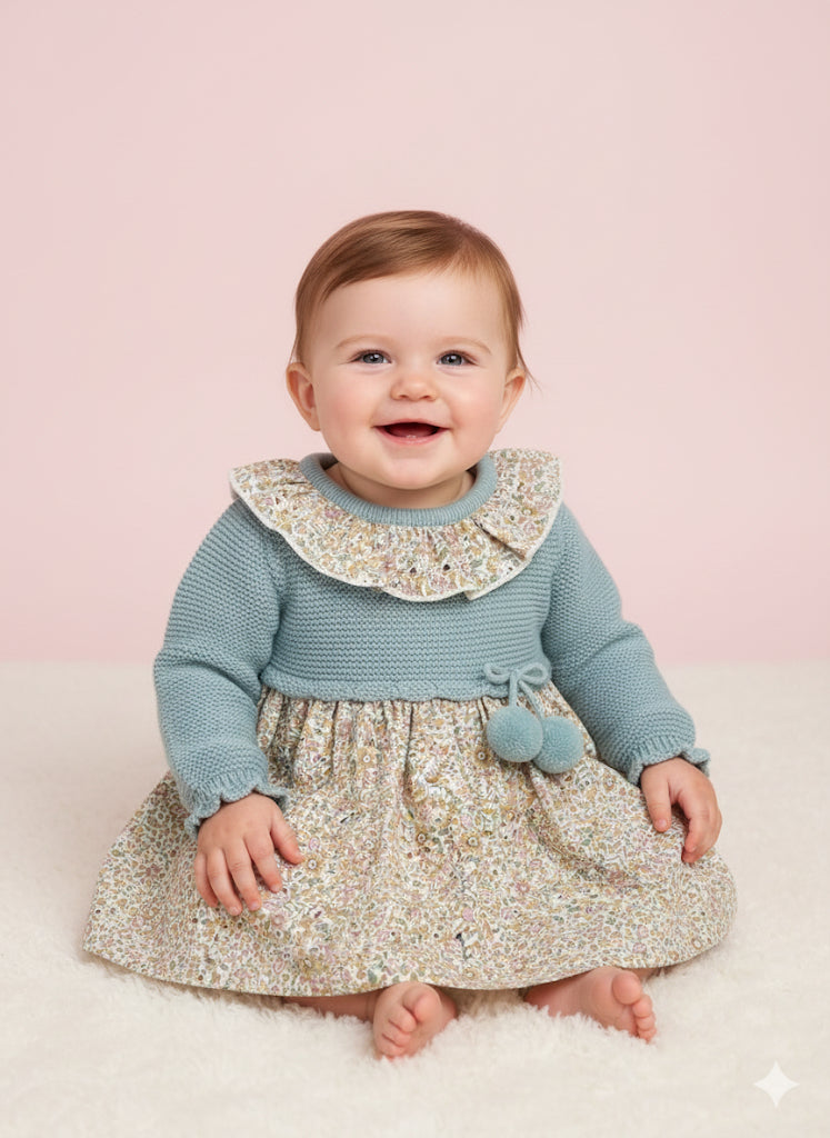 Vestido de bebe, la parte superior es de punto con pompones decorativo y cuello redondo con volante y abertura trasera, la zona inferior es de tela estampada de florecitas.