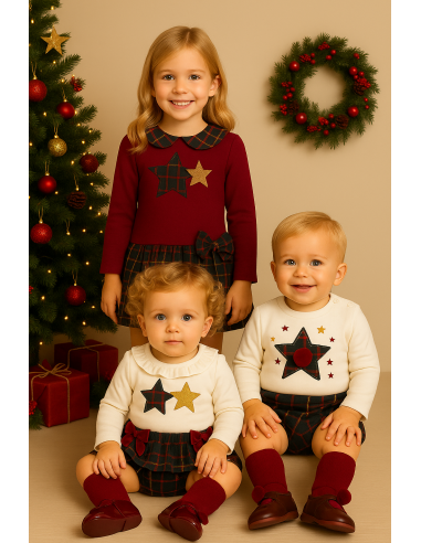Precioso vestido en felpa granate con pelito por dentro, los detalles del cuello y el volante del bajo en tejido de Viella de cuadros, con estrella en el delantero y lazo decorativo.