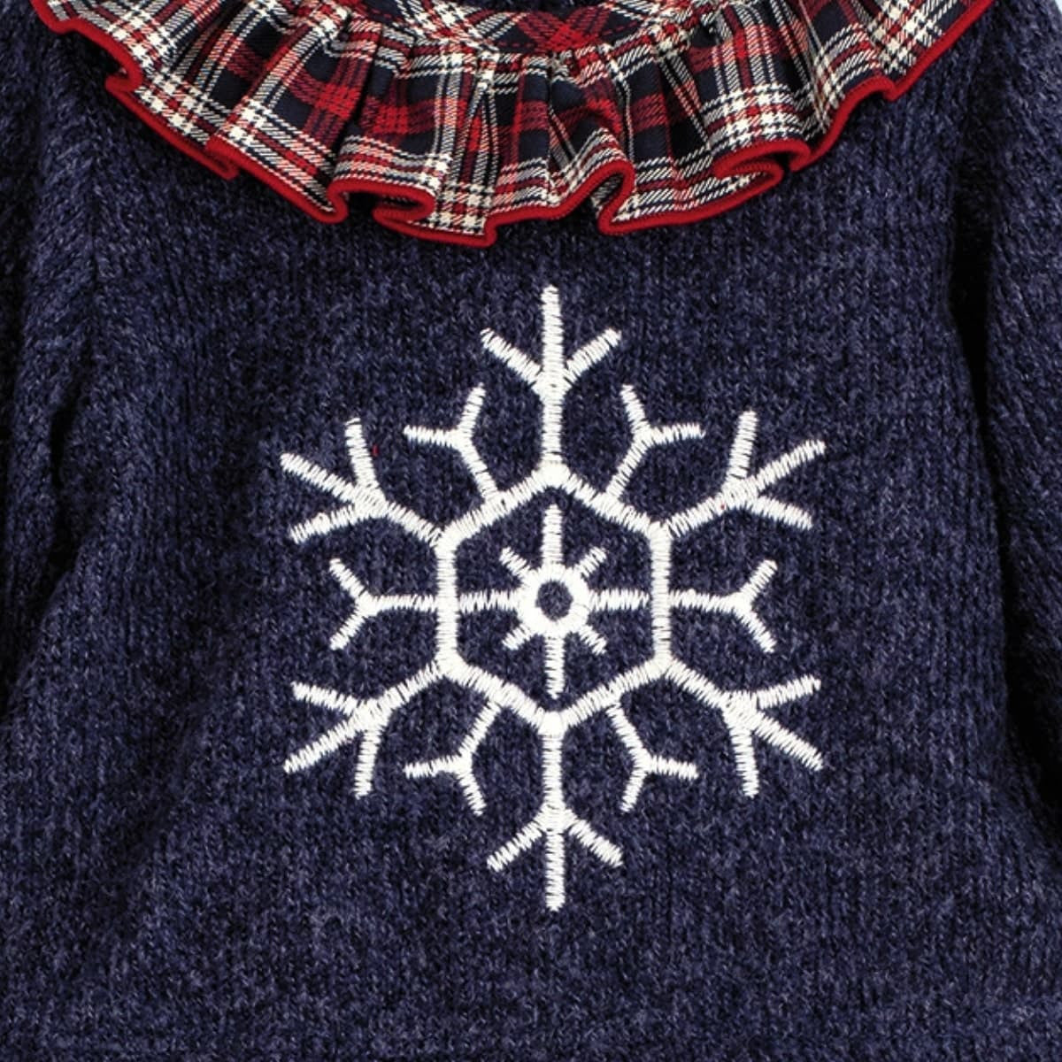 - Jersey suave en punto en azul marino con copo de nieve blanco bordado Cuello redondo con volante de cuadros Faldita braga integrada en tejido tartán navideño Gomas en piernas para un ajuste perfecto Cierre trasero con botones para vestir fácilmente Ideal para días frío. Perfecto para Navidad, sesiones de fotos y momentos especiales