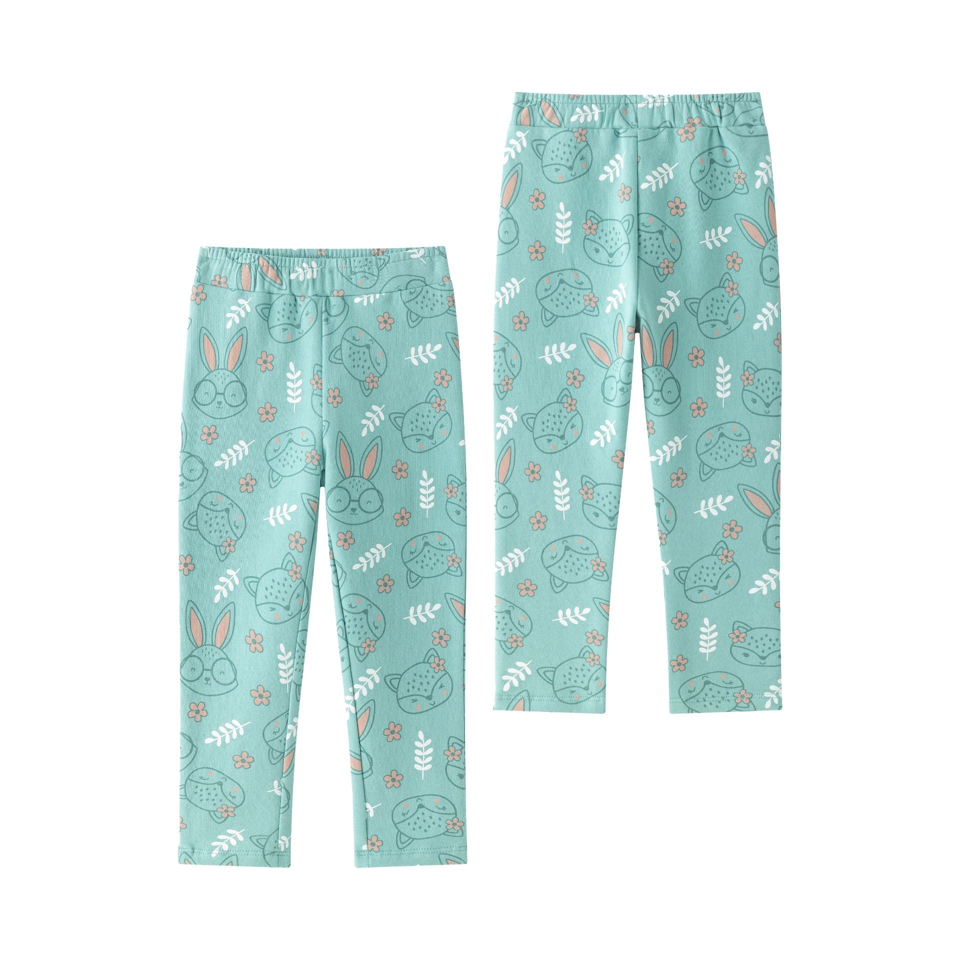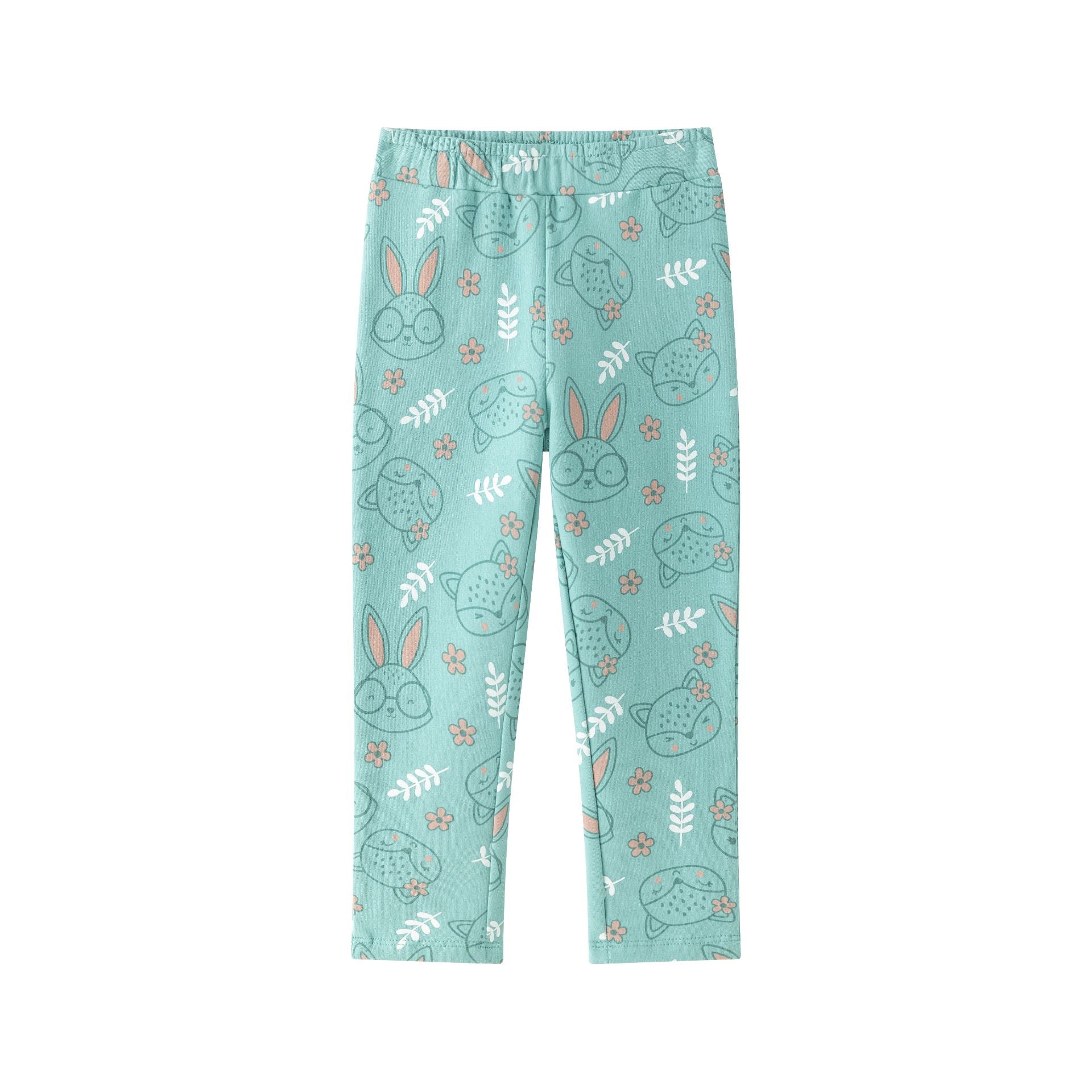 Legging de niña en color turquesa con estampado de cabezas de conejos, cintura con goma elástica.