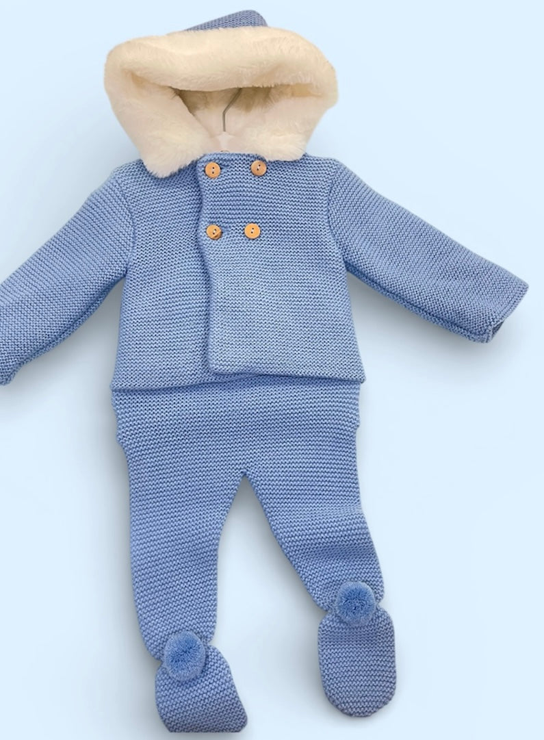 Conjunto tipo San Francisco en color azul azafata . Es un conjunto de chaqueta y polaina. La chaqueta va abotonada por delante, con capucha forrada de pelito, pantalón tipo polaina, con pompocito en los pies. Un básico para tu bebé que nunca pasa de moda.