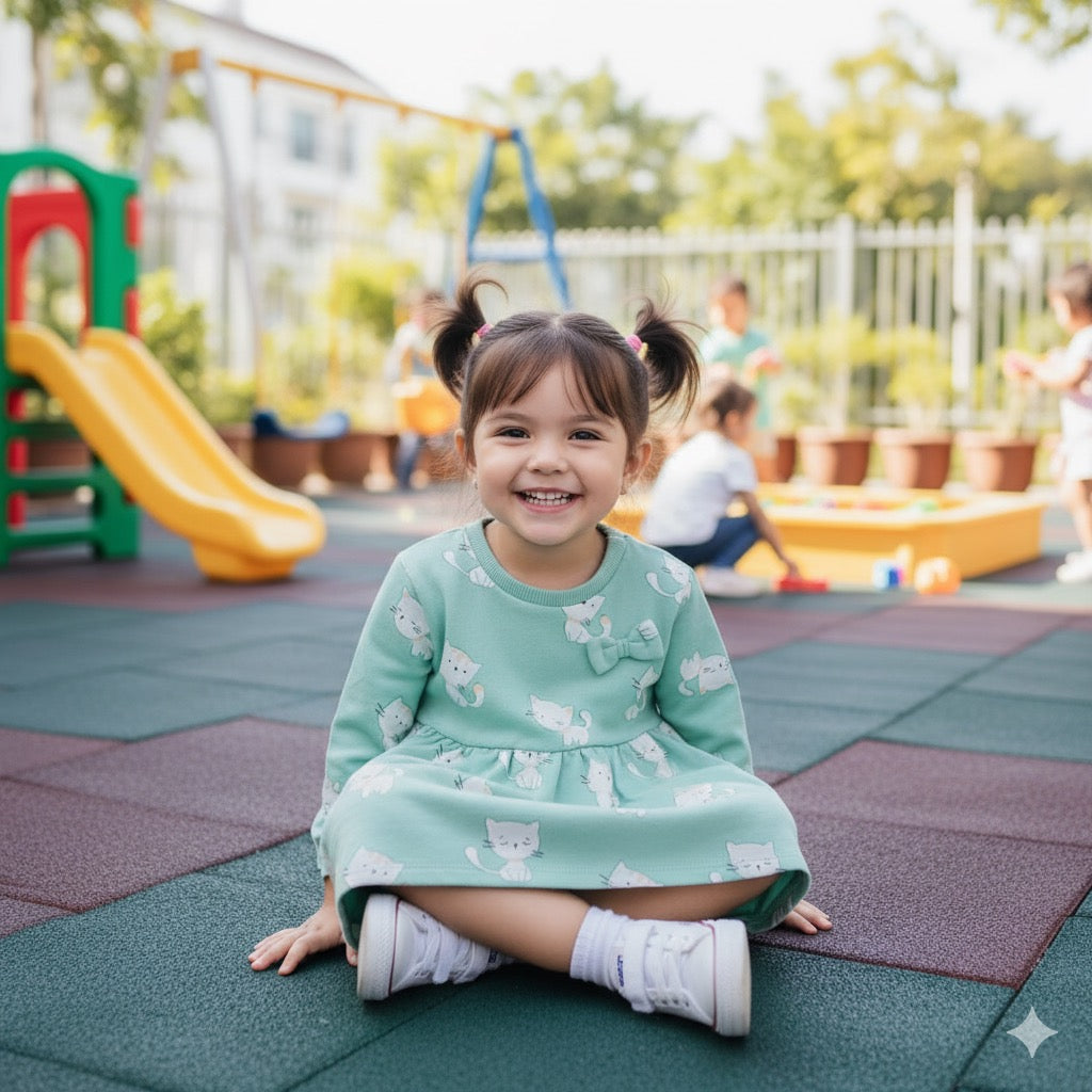 Vestido de algodón en verde con gatitos, de bebé niña, cuello redondo, corte en la cintura y lazo decorativo.